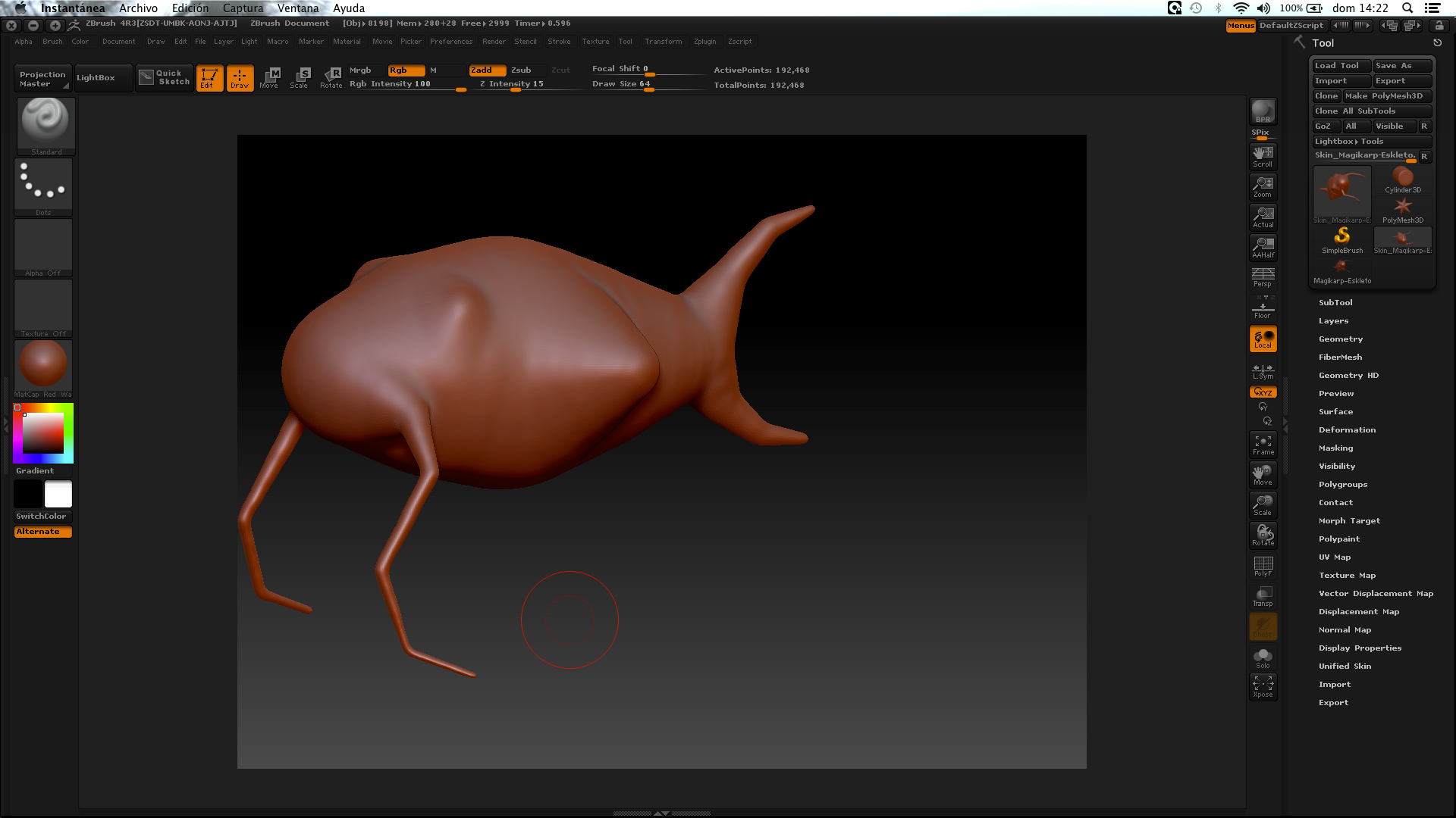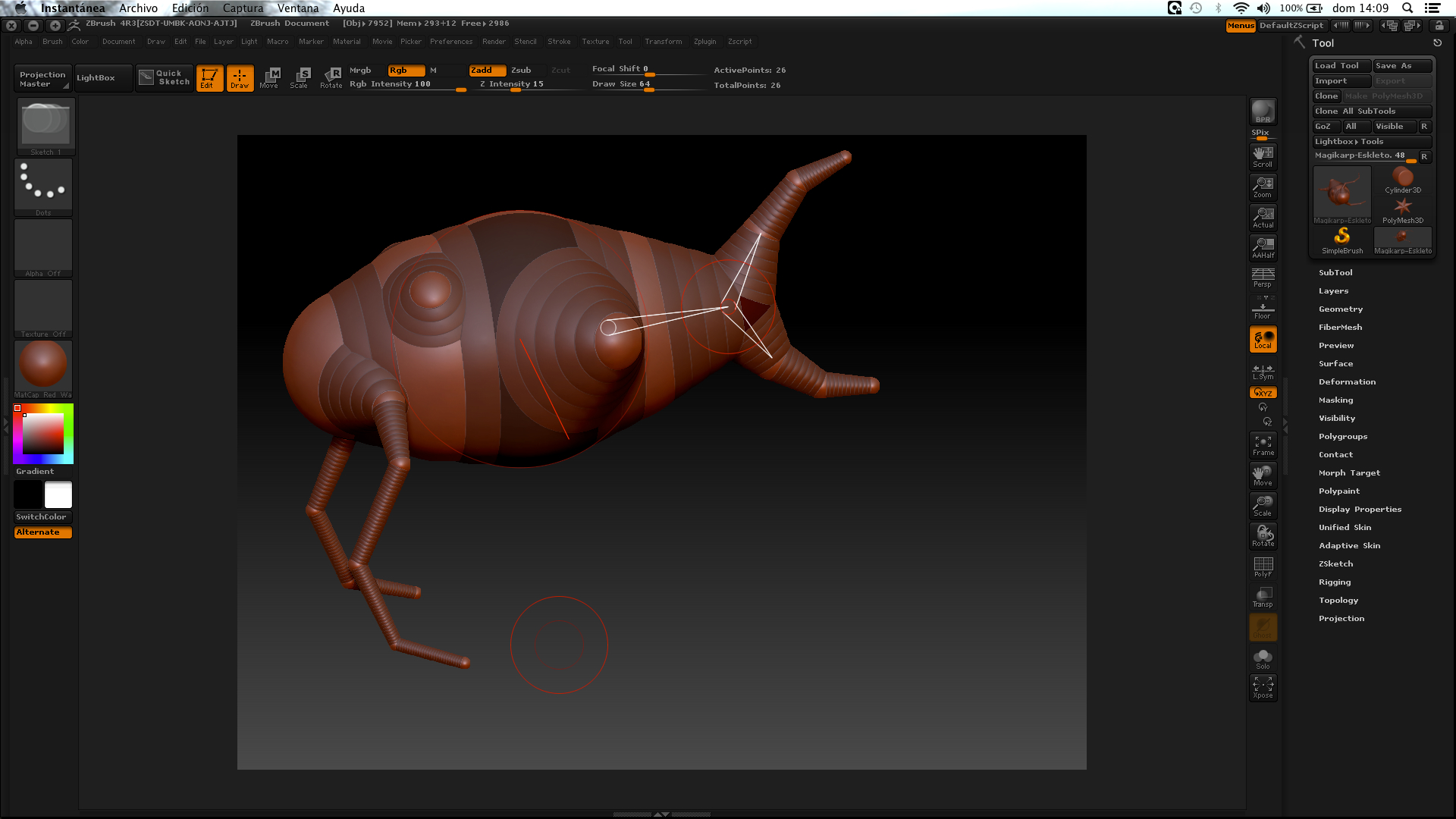 Estoy siguiendo un tutorial en el que se explica cómo hacer un pez. He hecho el esqueleto con varias ZSpheres (adjunto imagen) y le he puesto una unified skin con los siguientes valores: Resolution>448 y Smooth>50. Hasta ahí todo bien (adjunto imagen). El problema es que cuando intento alisar la escultura con el pincel Smooth, no hace nada. Los restos de las ZSpeheras que quiero alisar no desaparecen. He cambiado los valores del pincel (ZIntensity, Focal Shift), pero no consigo que funcione; el pincel Standar, por el contrario, parece que funciona bien.