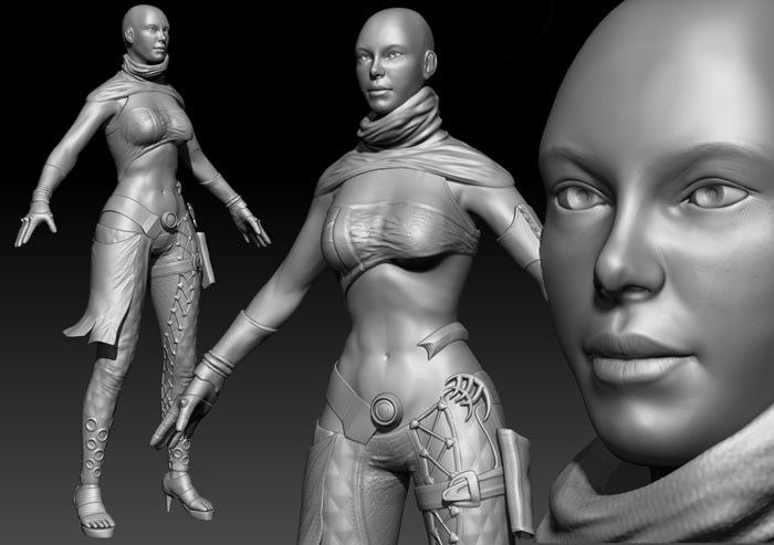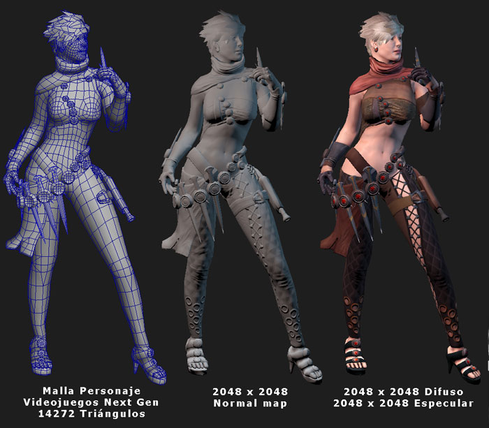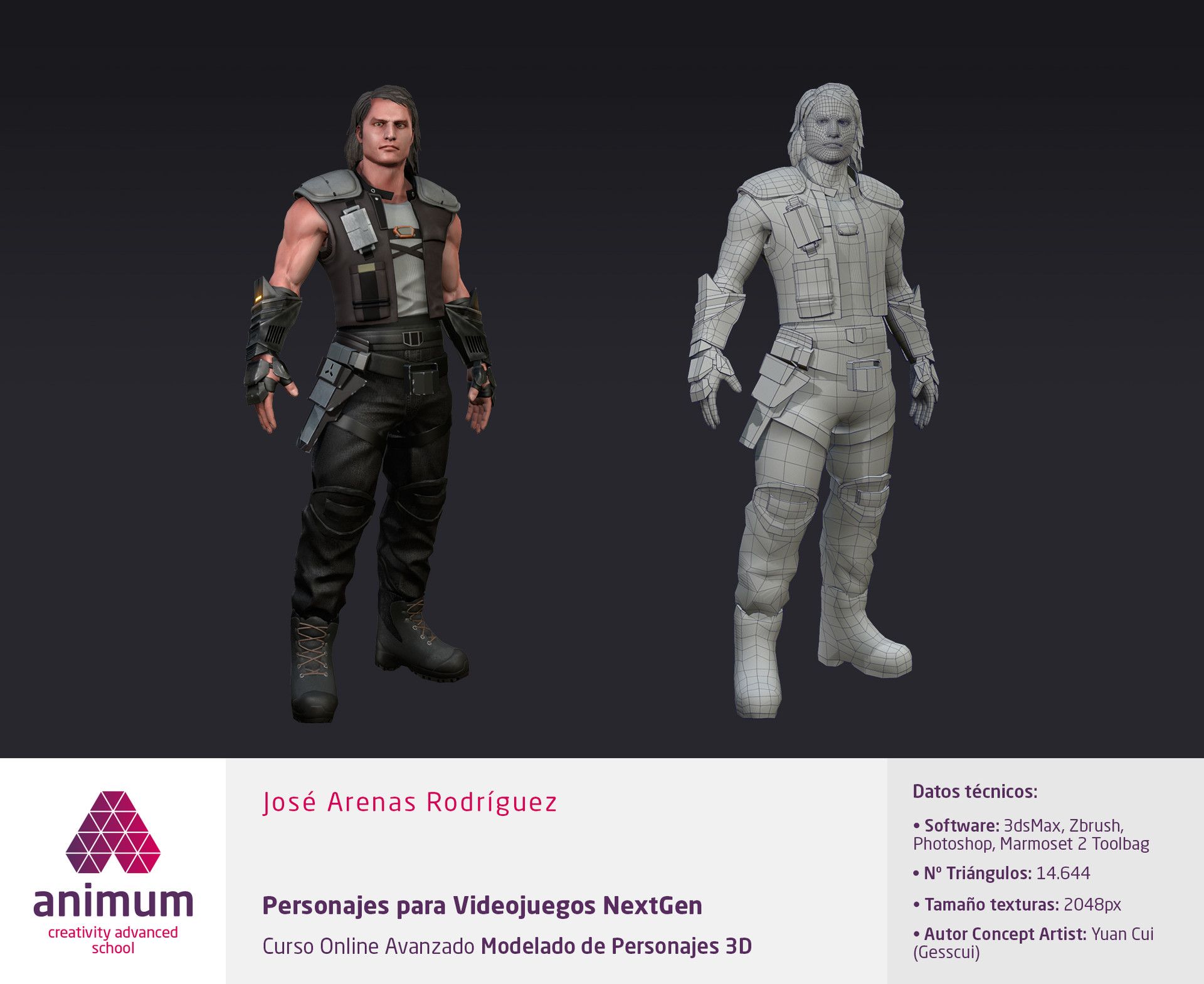 "Inicié la tarea construyendo la malla base, para más tarde esculpir todos los volúmenes y detalles con ZBrush. Tras el esculpido, trabajé la retopología con 3dsmax. El reto consistía en que teníamos un límite de 15.000 triángulos para él personaje completo, incluyendo ropas, complementos y armas. Finalmente, logré ajustar todo en algo más de 14.000".
