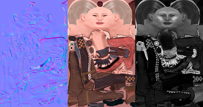 "Después de construir las UVS, vino el trabajo de texturizado: utilicé Photoshop para los colores principales, y Mudbox para pintado de algunos detalles. Realicé tres mapas de 2048x2048 para las texturas - Difuso, Normales y Especular, e incluí un canal de Opacidad y otro de Glow para los brillos".