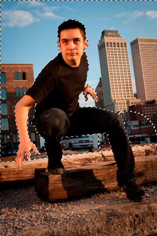 Abre la imagen original en tu Adobe Photoshop y selecciona el cielo y los edificios. Para este Paso el autor escogió la herramienta de Selección Rápida, sin embargo tú puedes elegir la herramienta con la que te sientas más a gusto a la hora de crear selecciones (pluma, lazos.).
