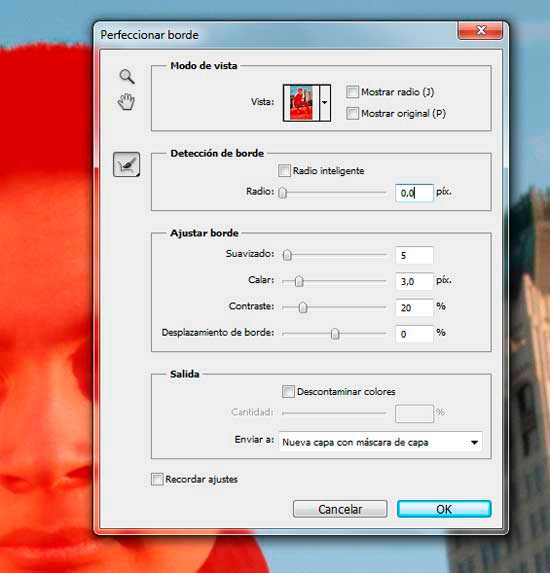Una vez completada la selección, ve a Seleccionar/Perfeccionar borde. Utiliza la herramienta de Perfeccionar Radio para dibujar sobre el borde del cabello y aplica los ajustes mostrados en la imagen. Cuando hayas terminado asegúrate de que la Salida se establece en Nueva capa con máscara de capa y haz clic en Ok.