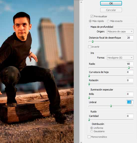 Con la nueva capa seleccionada, ve a Filtro/Desenfocar/Desenfoque de lente. Usa la misma configuración de la imagen de a continuación, asegurándote de que la fuente para el Mapa de Profundidad se ajusta a Máscara de Capa. Haz clic en Ok y, a continuación espera a que el filtro Desenfoque de lente se aplique.