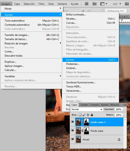 Ahora duplica la capa, y selecciona la nueva Máscara de Capa. Ve a Imagen/Ajustes/Invertir.