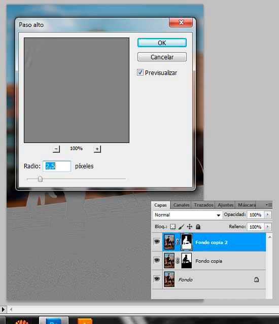 Selecciona la miniatura de esta nueva capa duplicada y ve a Filtro/Otros/Paso Alto. Ajusta el Radio a 2.5px.