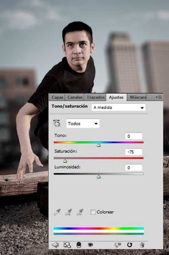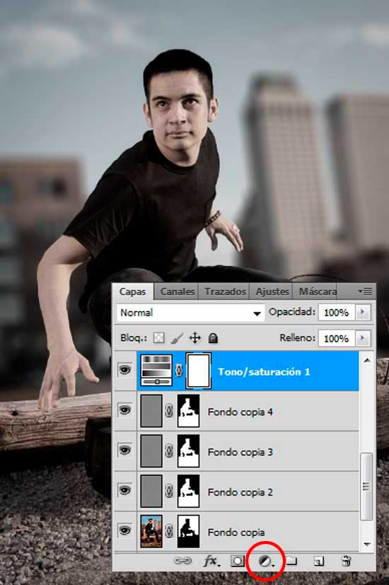 Clic en el botón de Crear nueva capa de relleno o ajuste en la parte inferior del panel Capas y selecciona Tono / Saturación. Ajusta la Saturación a -75.
