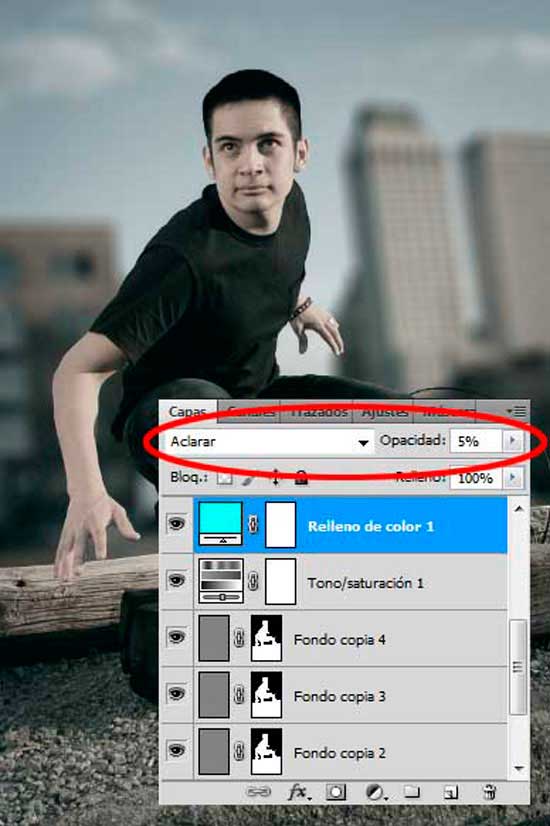 Clic en el botón de Crear nueva capa de relleno o ajuste en la parte inferior del panel Capas y selecciona Color uniforme aplicándole el color # 00fff6. Baja la Opacidad de la capa a un 5%, y establece su Modo de fusión en Aclarar.