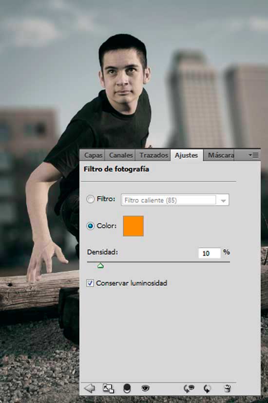 Clic en el botón de Crear nueva capa de relleno o ajuste en la parte inferior del panel Capas y selecciona Filtro de fotografía aplicando el color # ec8a00 con una Densidad del 10%.