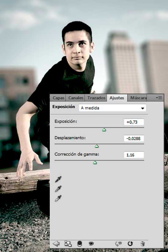 Clic en el botón de Crear nueva capa de relleno o ajuste en la parte inferior del panel Capas y selecciona Exposición aplicando los valores mostrados en la imagen de a continuación.