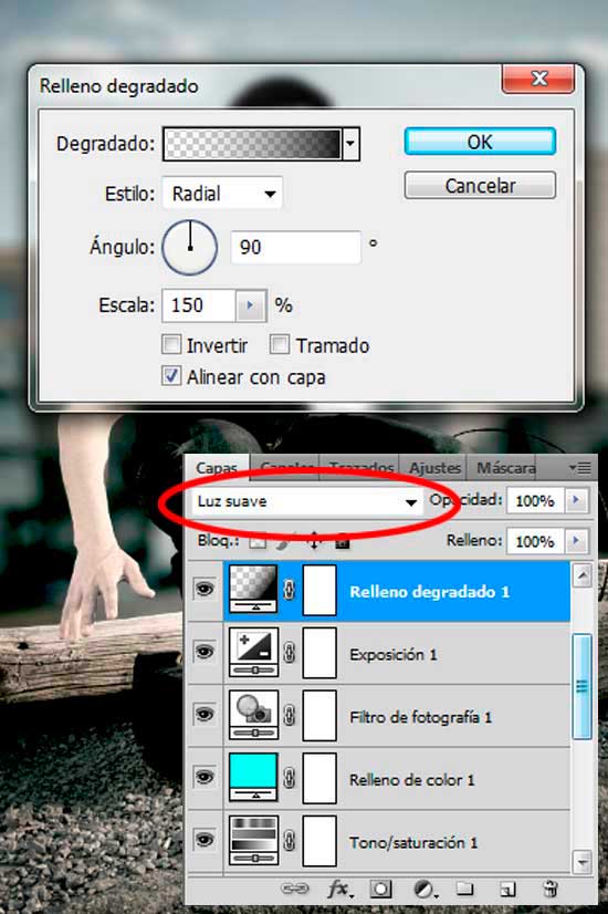 Clic en el botón de Crear nueva capa de relleno o ajuste en la parte inferior del panel Capas y selecciona Degradado de Estilo Radial. Aplica un Ángulo a este de 90º y una Escala de 150%. A continuación ajusta el Modo de fusión de esta nueva capa a Luz suave.