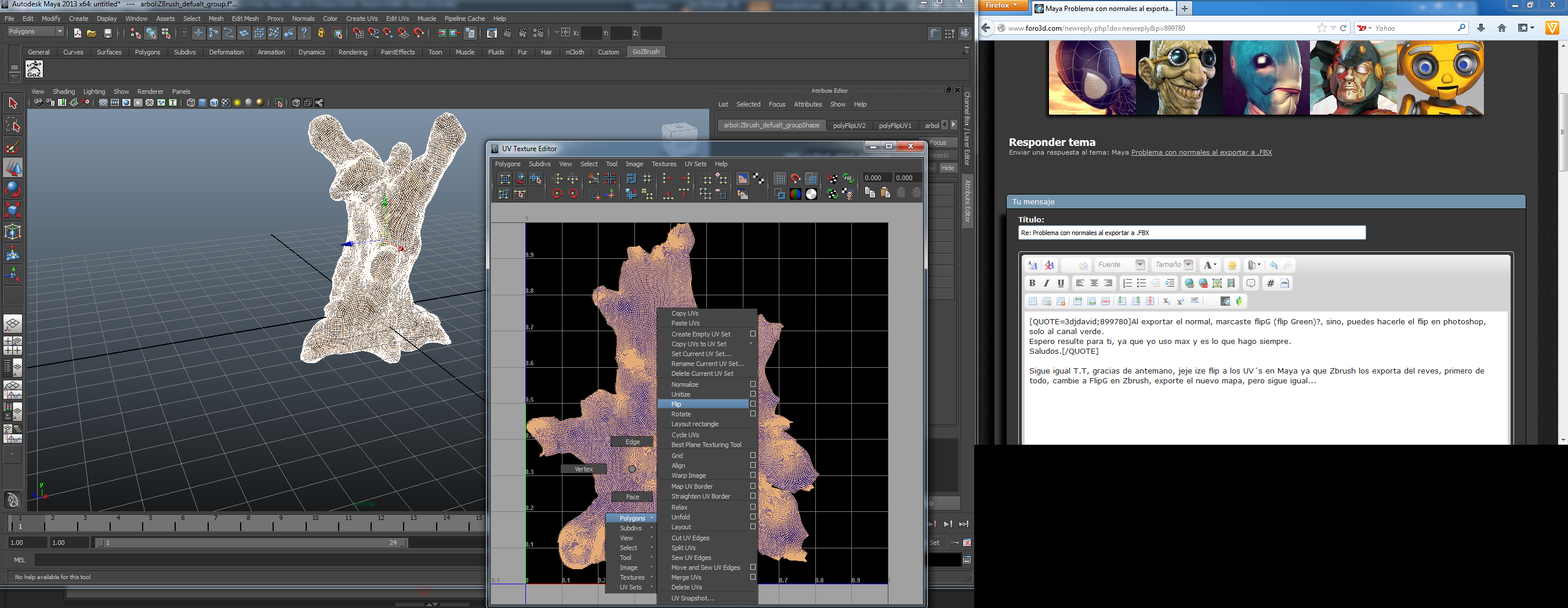 (Ojo: Al exportar desde ZBrush los UV y hacer FLIP en Maya, hay que exportar los mapas volteados, horizontal y verticalmente, y posiblemente ajustar los UVs en el UV Texture Editor ya qué estarán descentrados).