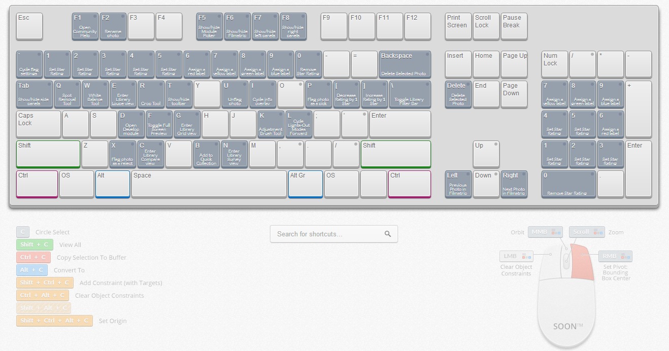 No es un programa en sí, es una teclado interactivo online que permite recordar o aprender los atajos de teclado, creado por Waldo Bronchart, la intención del autor es hacer lo mismo con otros programas de diseño gráfico, de momento está disponible para Adobe Photoshop, Blender y Lightrom.