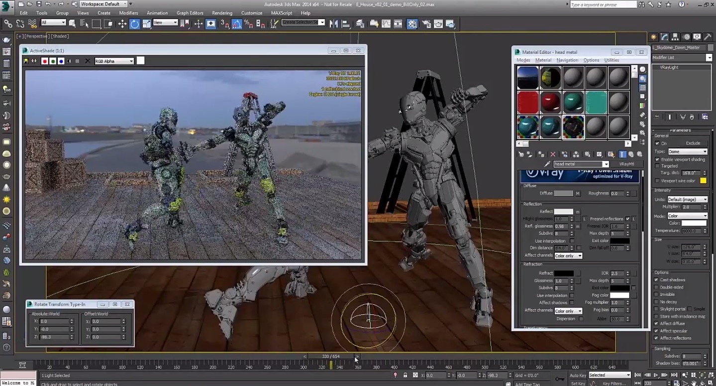 Esta preview fue presentada como parte de una demo técnica en la conferencia GTC de Nvidia 25 de marzo 2014, es un trabajo en curso destinado a ilustrar los recientes avances en gráficos, capacidades de hardware y software. Render con V-Ray RT GPU 3.0 para 3ds Max y con Nvidia K6000s K40s en 3DBOXX 4920 GPU Editión, el uso medio de RAM de vídeo entre 6 y 7 GB y el tiempo medio de render entre 5 y10 minutos (DOF y desenfoque de movimiento están renderizados en cámara).