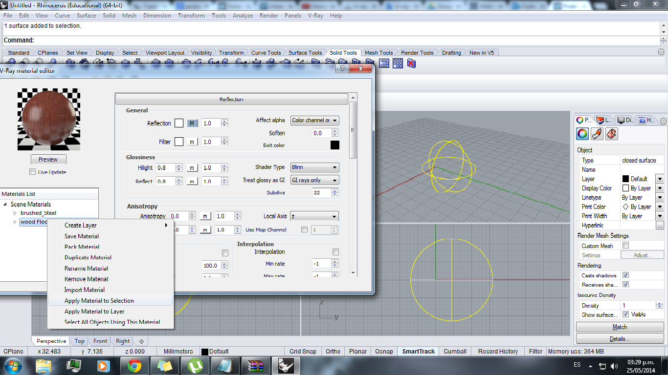 Buenas tardes, recién acabo de registrarme porque no encontré respuesta a mi problema. Instalé V-ray para él Rhinos 5 descargué unos materiales, probé hacer esferas, abrí el menú para cargar el material (piso de madera) seleccione la esfera y le di aplicar material a selección, pero no pasa nada no sé qué tengo que hacer, que hice mal o que me faltó por hacer. Muchas gracias.