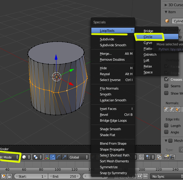 Luego seleccione un loop de forma circular y presionas W > Loop Tools > Circle.