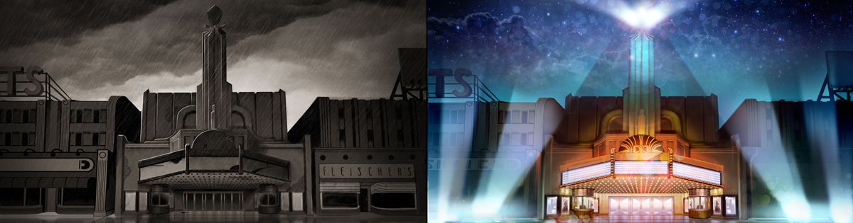La mayor parte de la película dentro de una película son fondos con pinturas mate. Fue un divertido desafío integrar los personajes con las pinturas mientras nos asegurabamos de que se vieran bien. Las sombras tienen que verse a través de las superficies. Es difícil mover los personajes a través de escenas híbridas en 2D y 3D. En la escena en la qué Morris sostiene el puente, eso es sólo una pintura mate, tuvimos que usar máscaras.