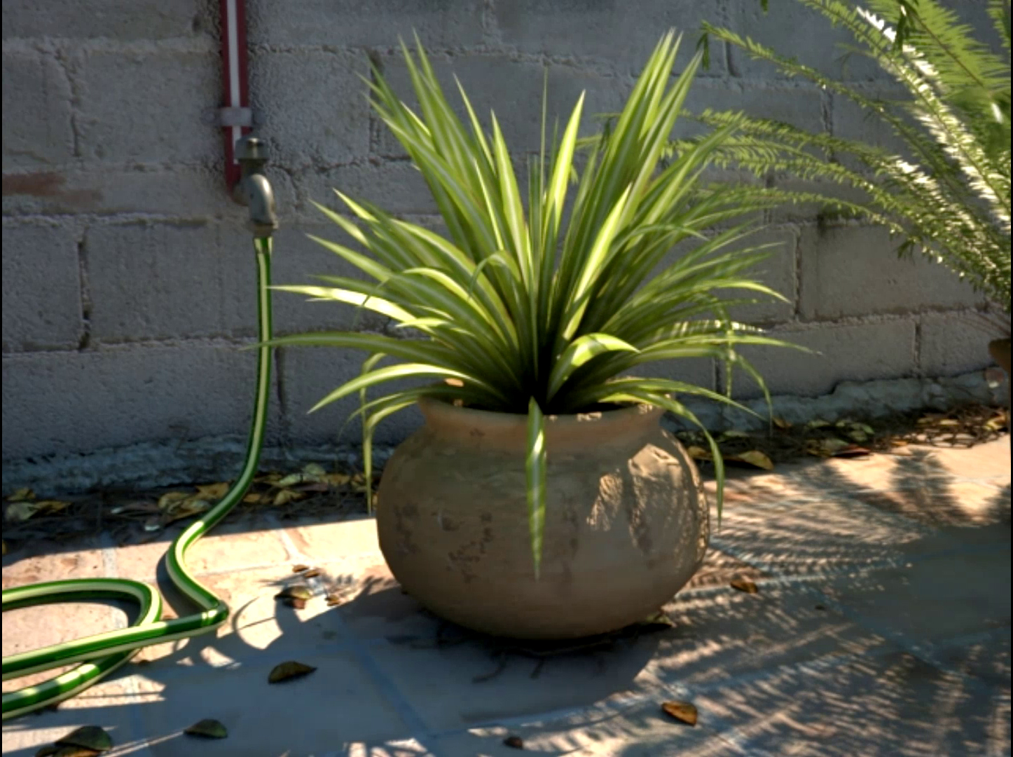 Las sombras de las hojas que se mueven están generadas por dos vías simultáneamente, ambient Occlusion y Vray Dirt aplicado al suelo, por cierto, excluí de Vraydirt a la manguera de riego, y otros objetos que por haber estado presentes durante la solución del irradiance no necesitan generar nueva sombra pues ya está resuelta. En casode no excluirlos se genera una sombra resultante muy profunda, que puede no quedar mal, pero para mí gusto hace muy contrastada a la escena. Vraydirt esta expandido en unos 25 centímetros de radio.