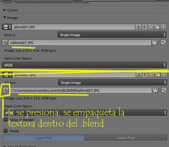 Y luego hay el empaquetamiento que lo que se hace, es empaquetar esas imágenes al Blend, haciendo que suba de tamaño, pero entonces, estás seguro que no se va a perder esa imagen. Tienes la desventaja, de que si tienes que retocar la imagen con el UV/Image Editor, primero te toca desempaquetar, retocar la imagen, y volver a empaquetar.
