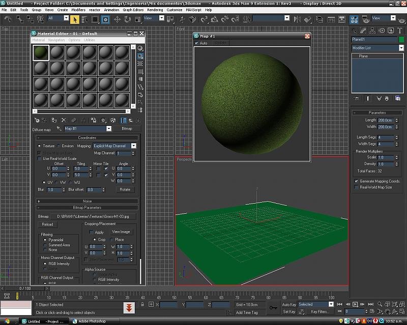 Creamos nuestro material, que tendremos que aplicar al plane y al Vray Fur que también tiene que tener el material, aquí en este caso yo aplique el tileado directamente al material para no aplicar el UVW después.