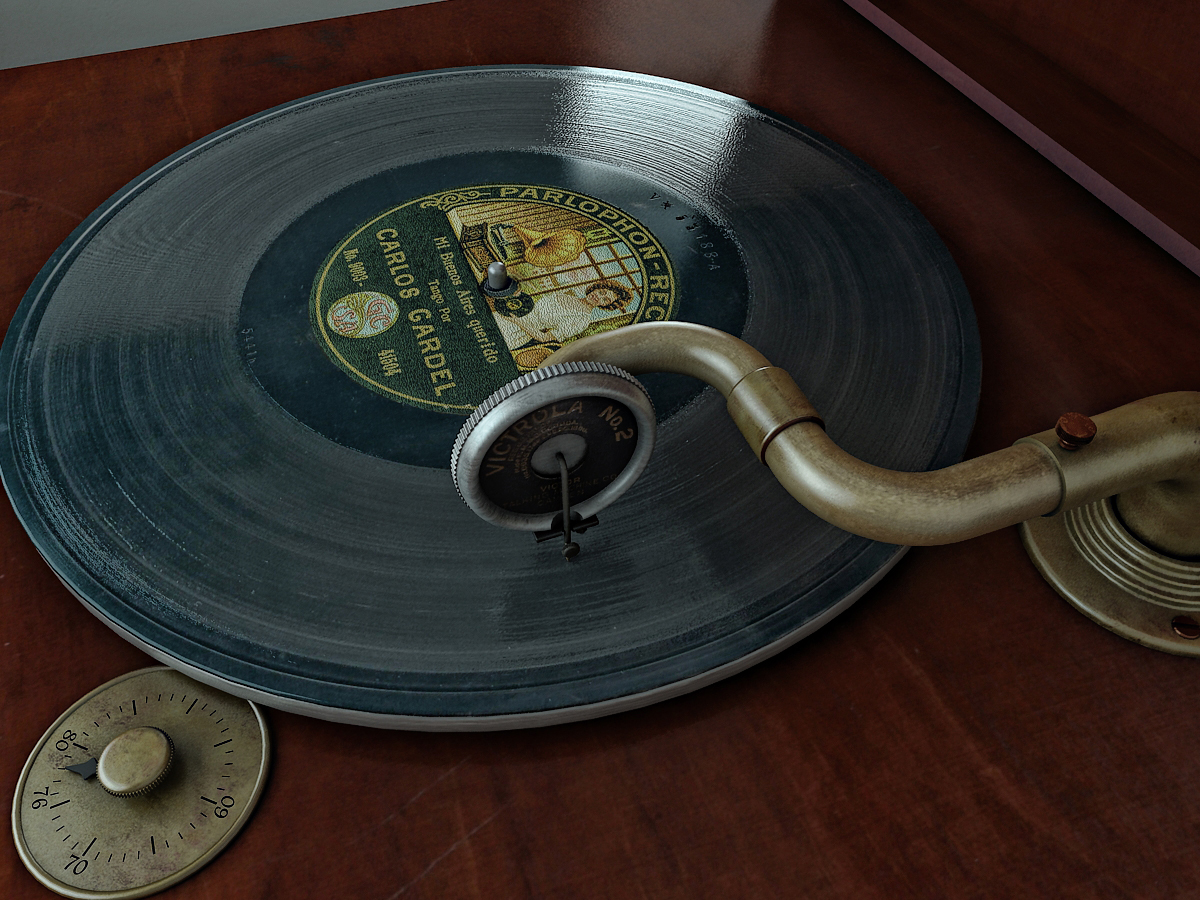 Bueno, pués la vitrola ya está terminada y las dos imágenes que subo también son ya imágenes acabadas. Tengo pensado para este trabajo, realizar otra vista cercana al estilo de estas dos (pero con otra iluminación) y dos más con un enfoque más lejano para las cuales tendré que modelar un entorno coherente.