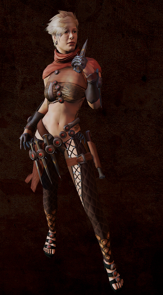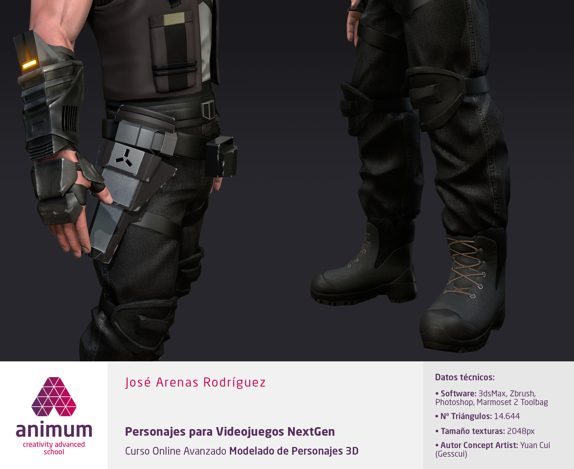 "Estas imágenes forman parte del último proyecto del curso de modelado, en el que teníamos que elegir un personaje y trabajarlo cómo se haría en la producción de un videojuego Next Gen. El personaje que elegí, aconsejado por mi tutor, fue "The Crescent Mon" de Guild Wars 2, basado en un concept de Hyojin Ahn. Me tomé la libertad de llevarme el personaje a un estilo algo más realista, y menos Manga qué el concept original. Al principio, me asustó bastante la idea de hacer un personaje con tanta cantidad de detalles en ropa y objetos. Y aunque fue un duro trabajo, conseguí cumplir los plazos de entrega".