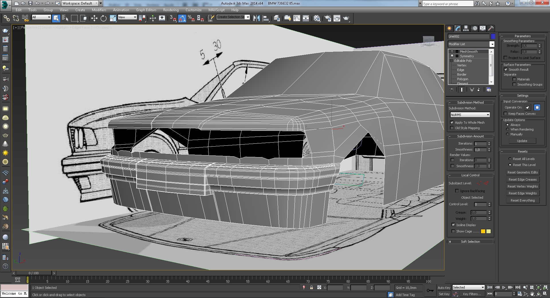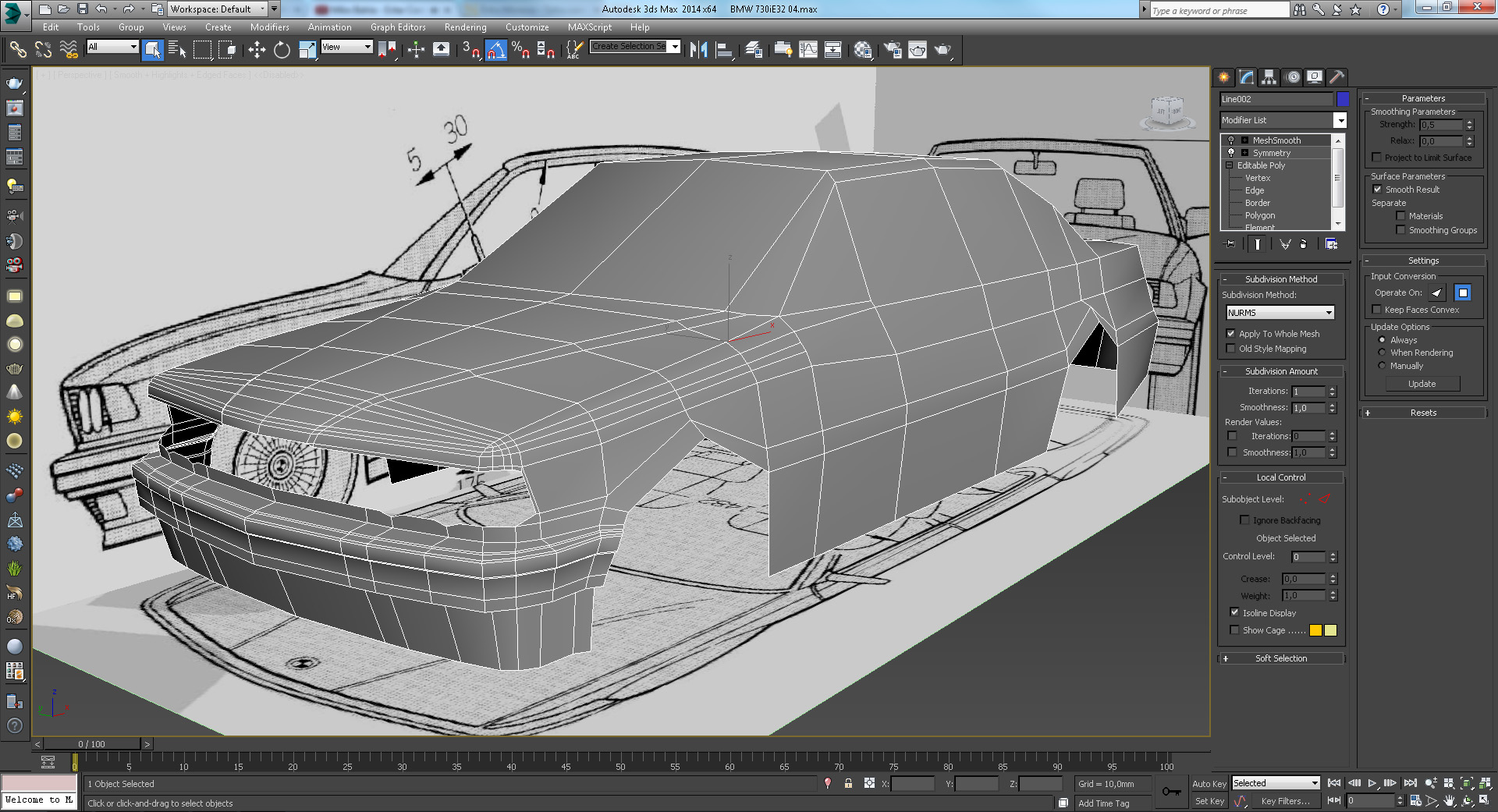 Aquí comienza el proceso de refinar la malla, es un Edit Poly con dos modificadores Symmetry y MeshSmooth con método NURMS de subdivisión.
