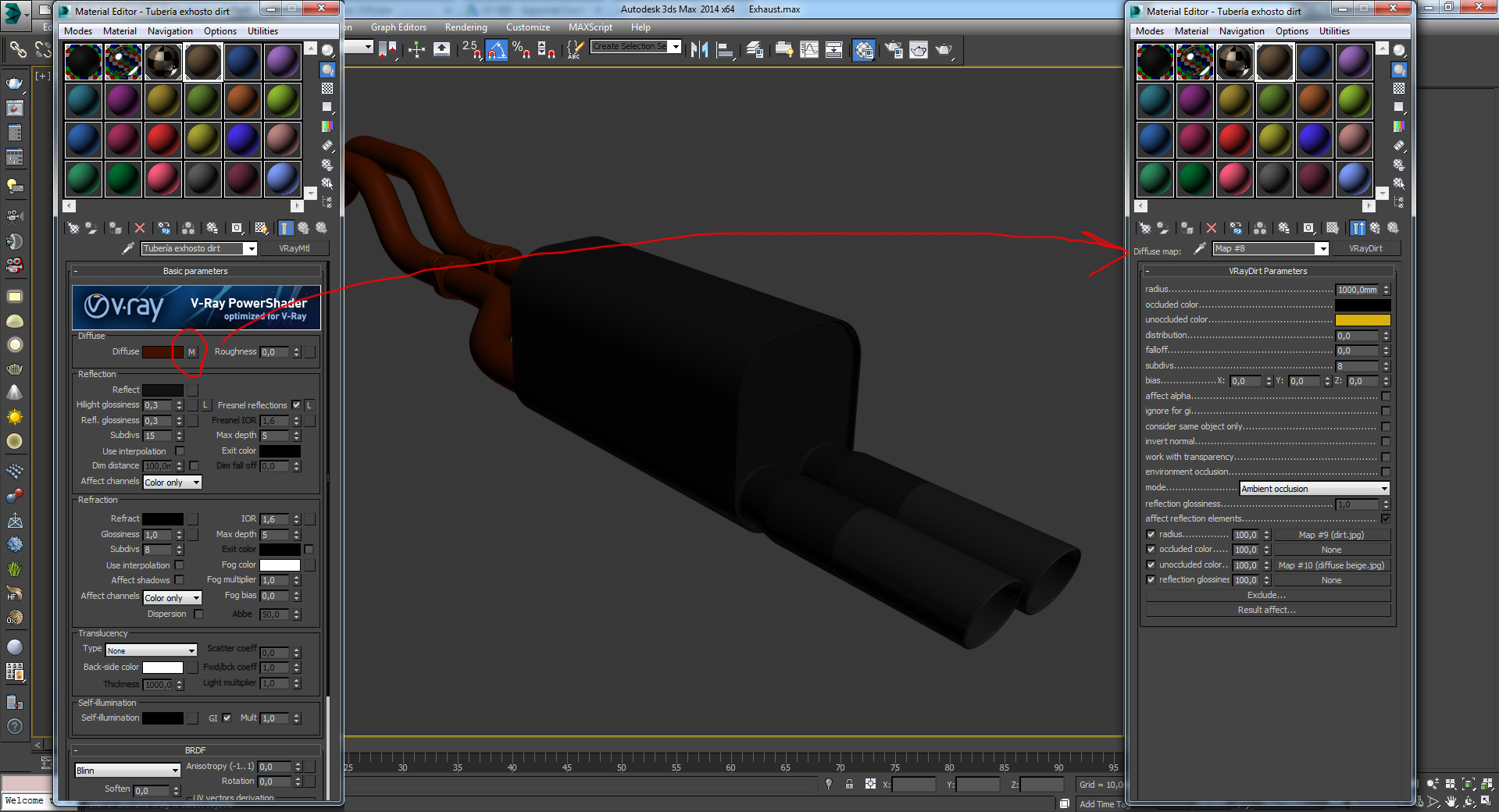 Y el sistema de escape, la idea con este es que cambié el silenciador/exhoesto final por uno de aftermarket que tenía salidas circulares y no rectangulares (modificación que realizaban sus propietarios con bastante frecuencia), entonces quise simular el sistema de escape original con su respectivo desgaste (usando un material Vray con un mapa Vray Dirt en el Diffuse).