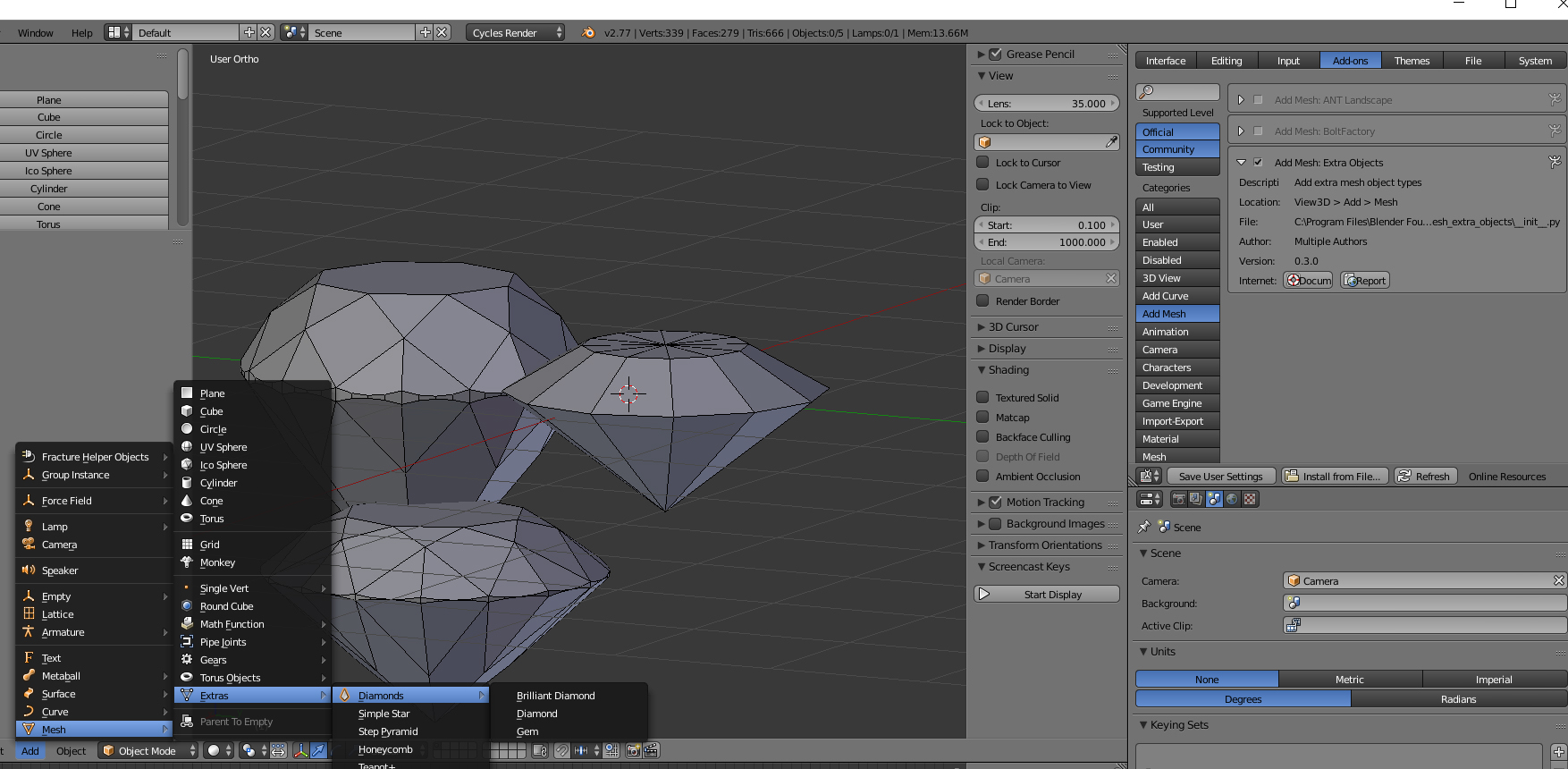 Blender tiene un addon, Add >> Mesh: Extra Object con el que puede crear diamantes o brillantes.