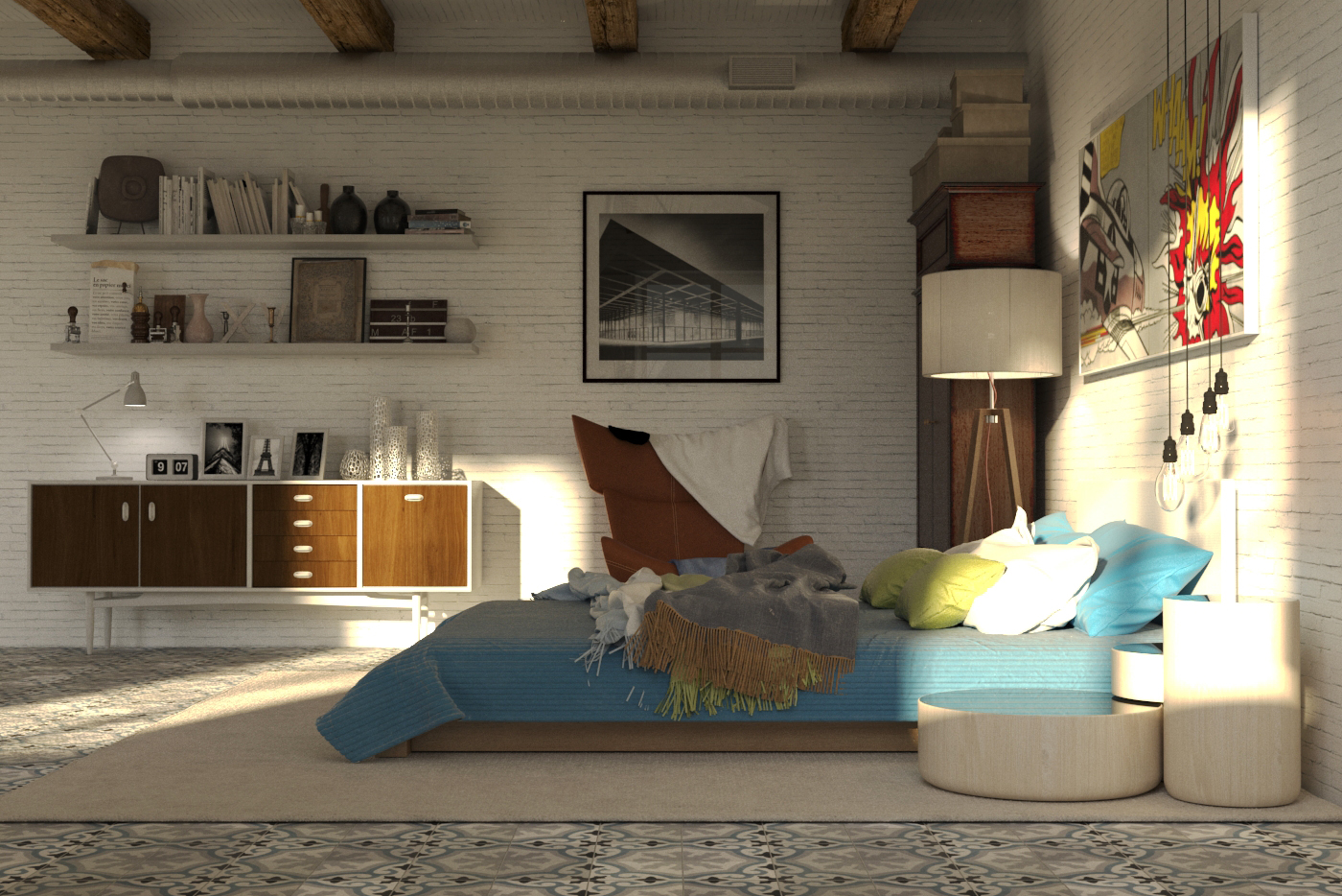 Una habitación de un loft tipo casa antigua qué estoy preparando. Mezcla de mobiliario antiguo y moderno. Aún acabando de ajustar la composición e introduciendo decoración, diría que está un poco por debajo de la mitad en cuanto a finalización. Quiero meter unos árboles delante de la ventana para darle más juego a las luces y sombras que entran en la habitación, a ver si sale bien.