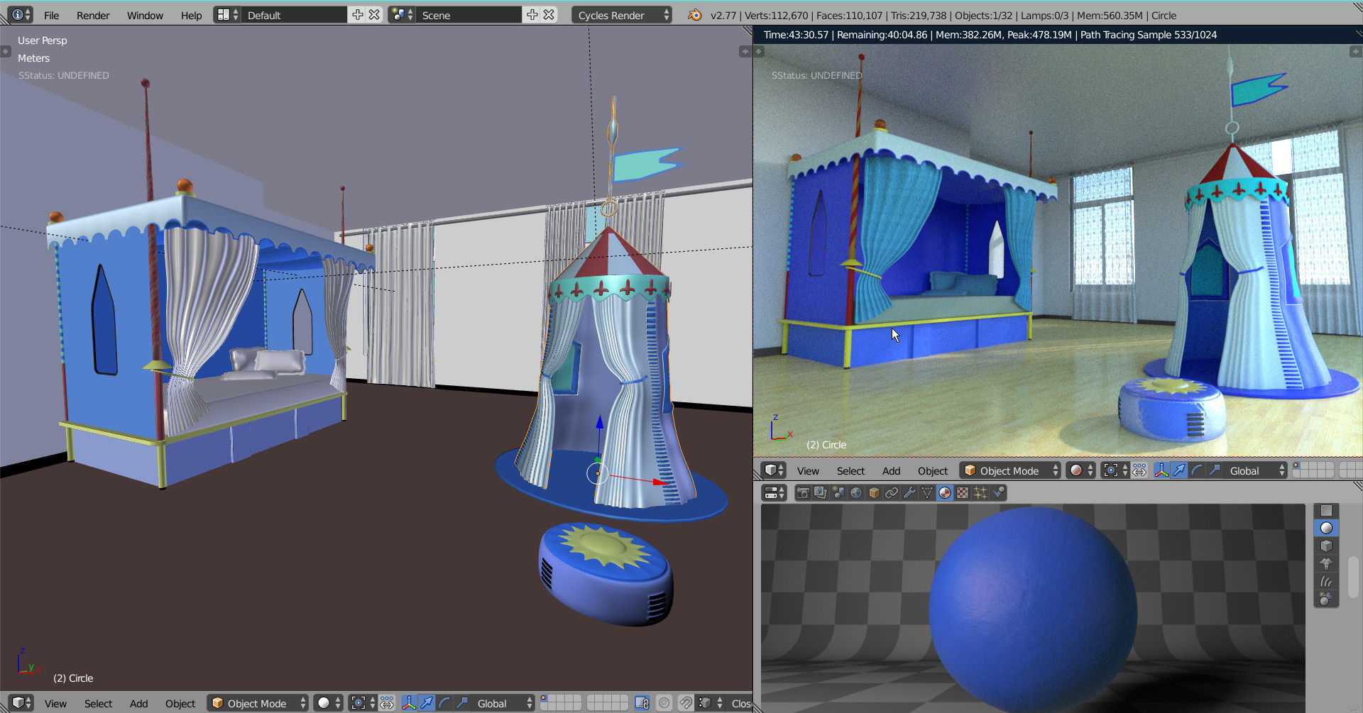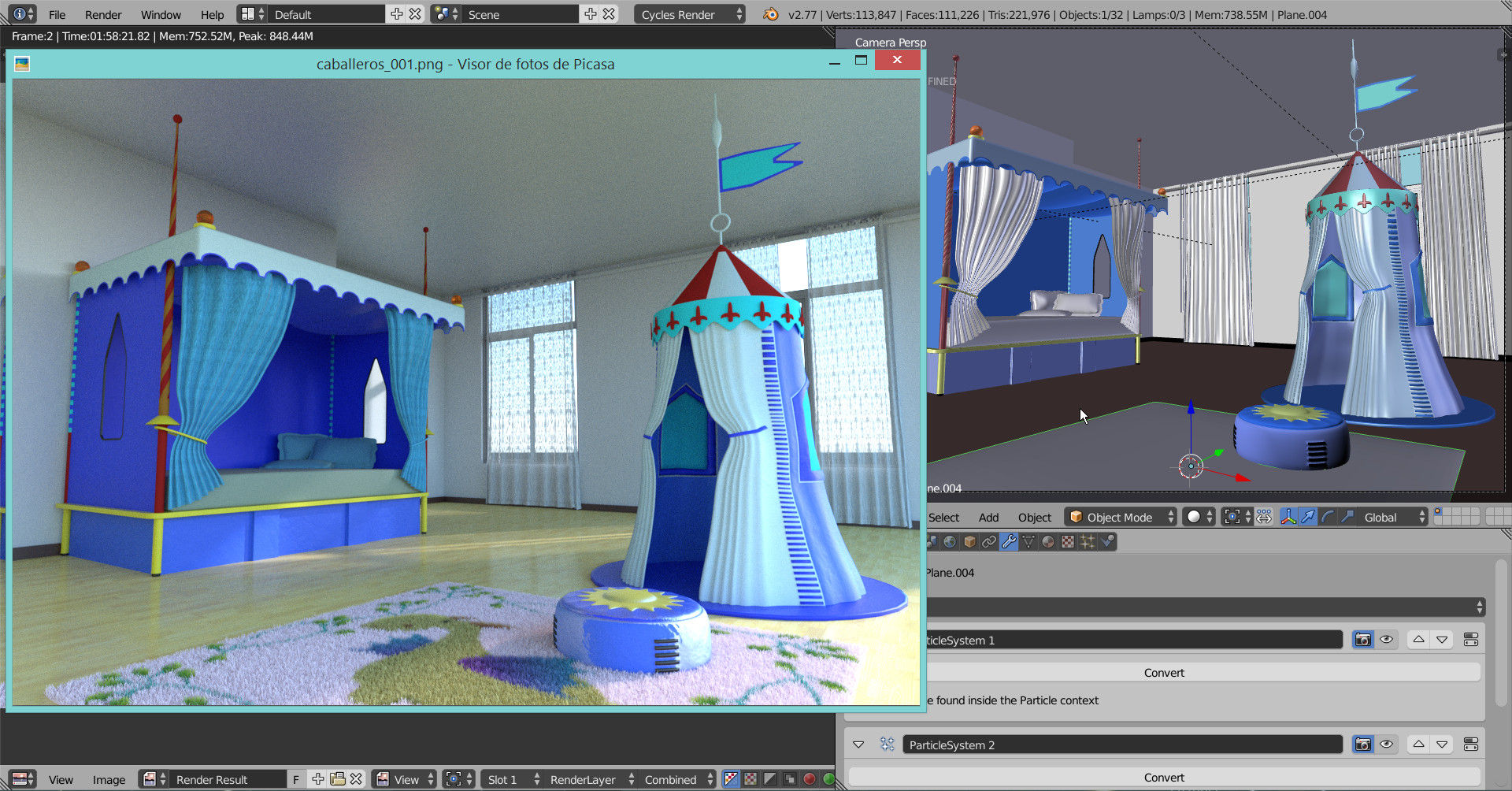 Aquí imágenes del avance del render que publiqué en trabajos terminados sobre un cuarto de niños. Blender + Inkscape + Gimp para algunos retoques, saludos a todos. -- IMÁGENES ADJUNTAS --