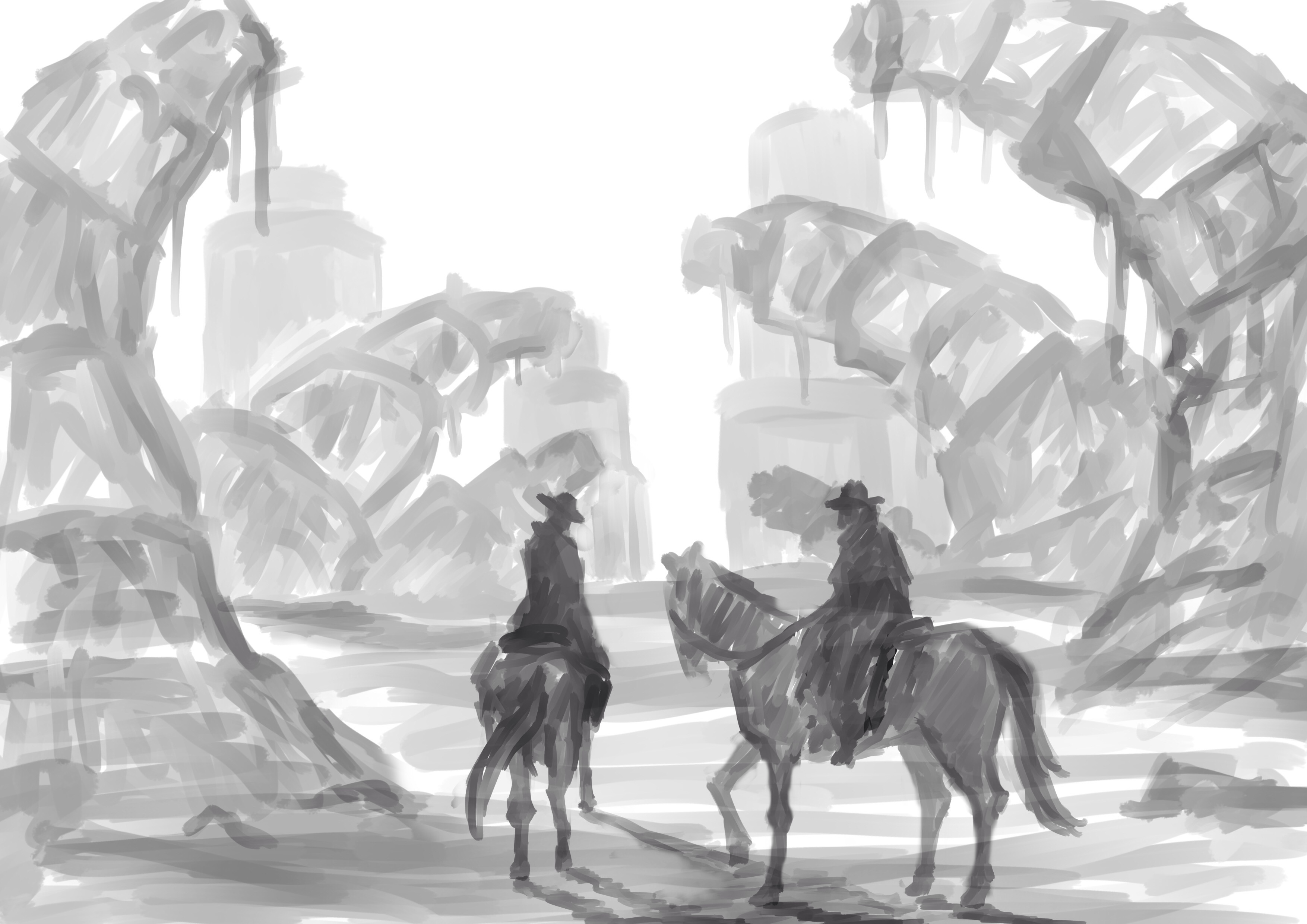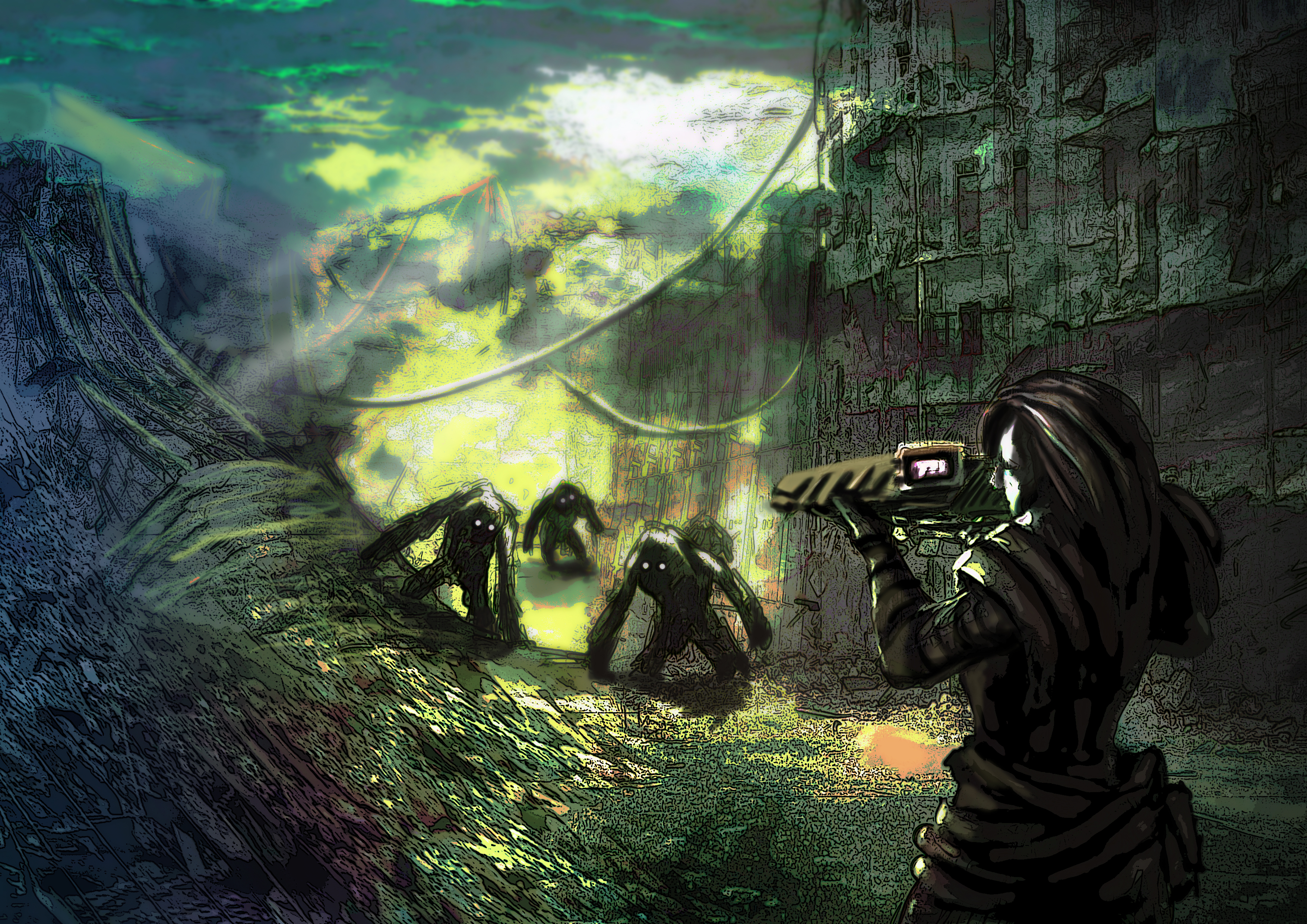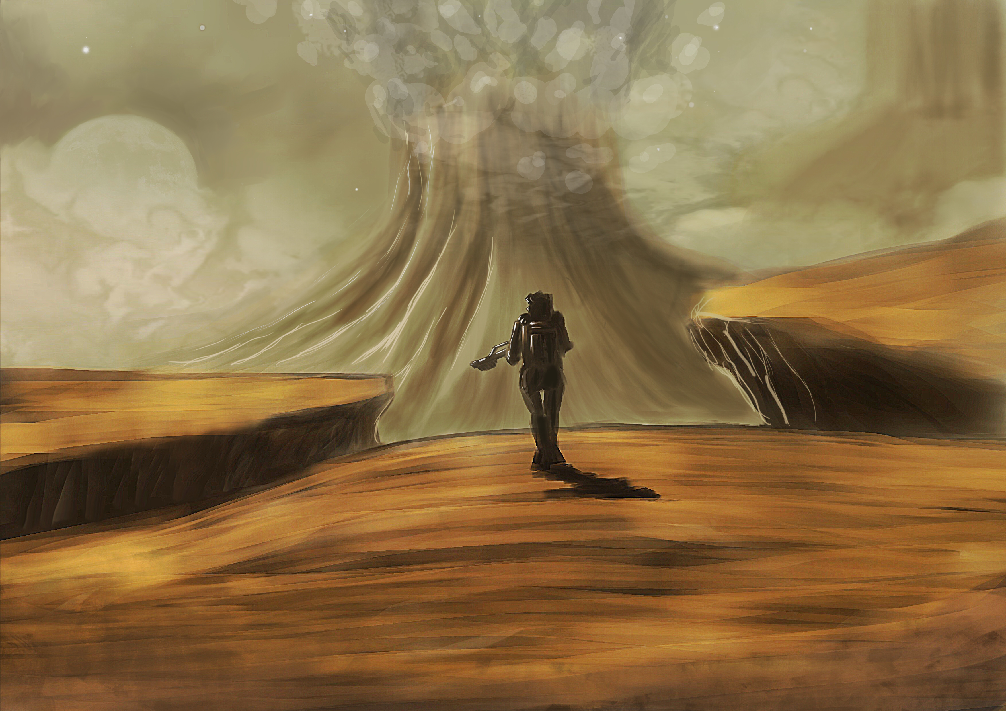 De estos 3 el que más me gusta es central del del río de laba. Mono críticas constructivas on: El primero me gusta el concepto. Creo que se podría mejorar rodando hacia la izquierda la explosión de humo, y dejando el personaje más a la derecha, para crear una composición más interesante. Si tenemos los elementos en el centro, da una impresión de estatismo y creo que para una estampa así, buscas que el ojo se fije en lo impresionante de la explosión y lo insignificante del personaje que la mira asombrado, que por otra parte la postura qué tiene despista, sé que está de espaldas a cámara por el arma, pero la colocación o el efecto que hacen los pies parece que estuviera de frente dando pasos hacia cámara.