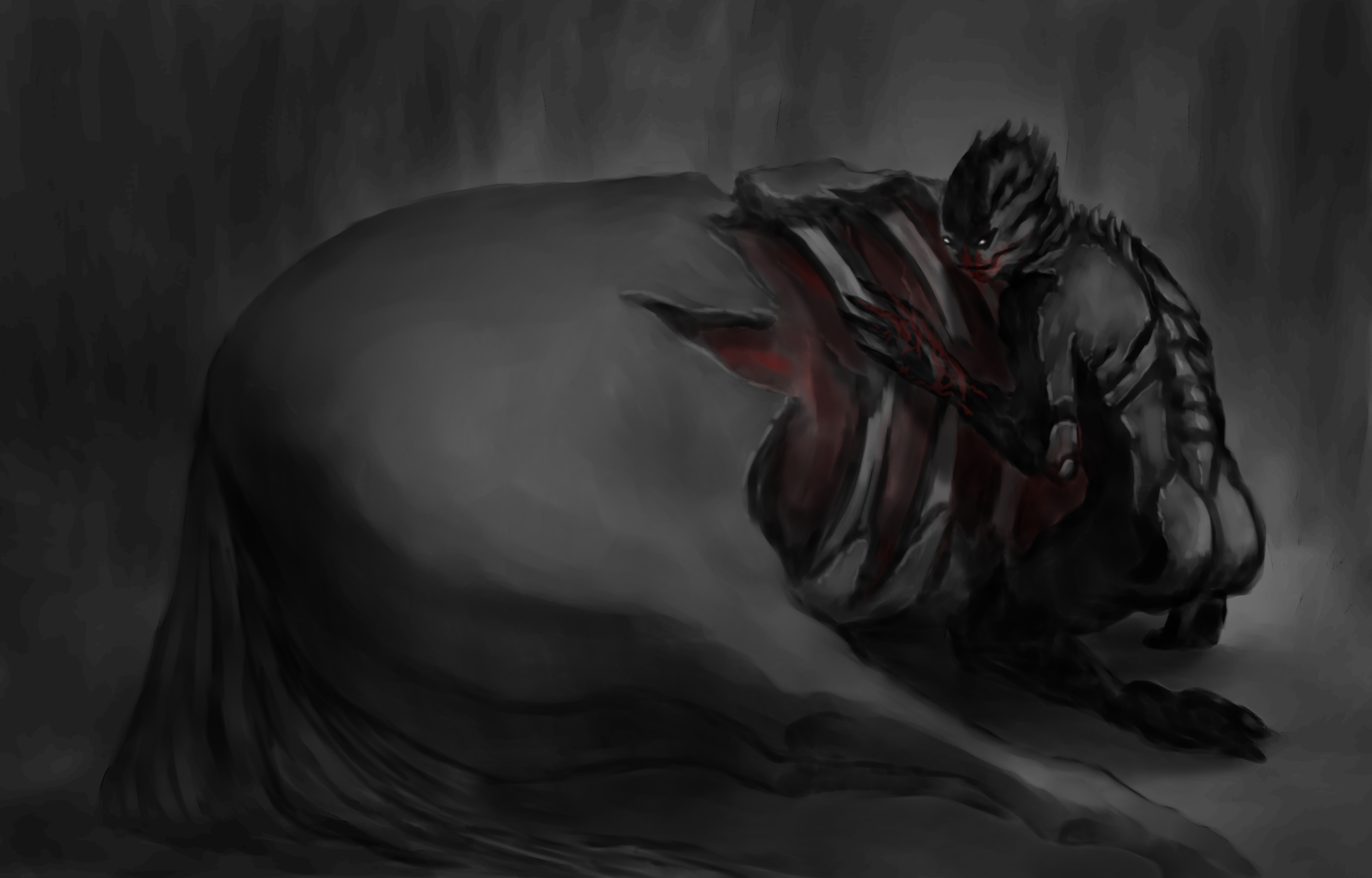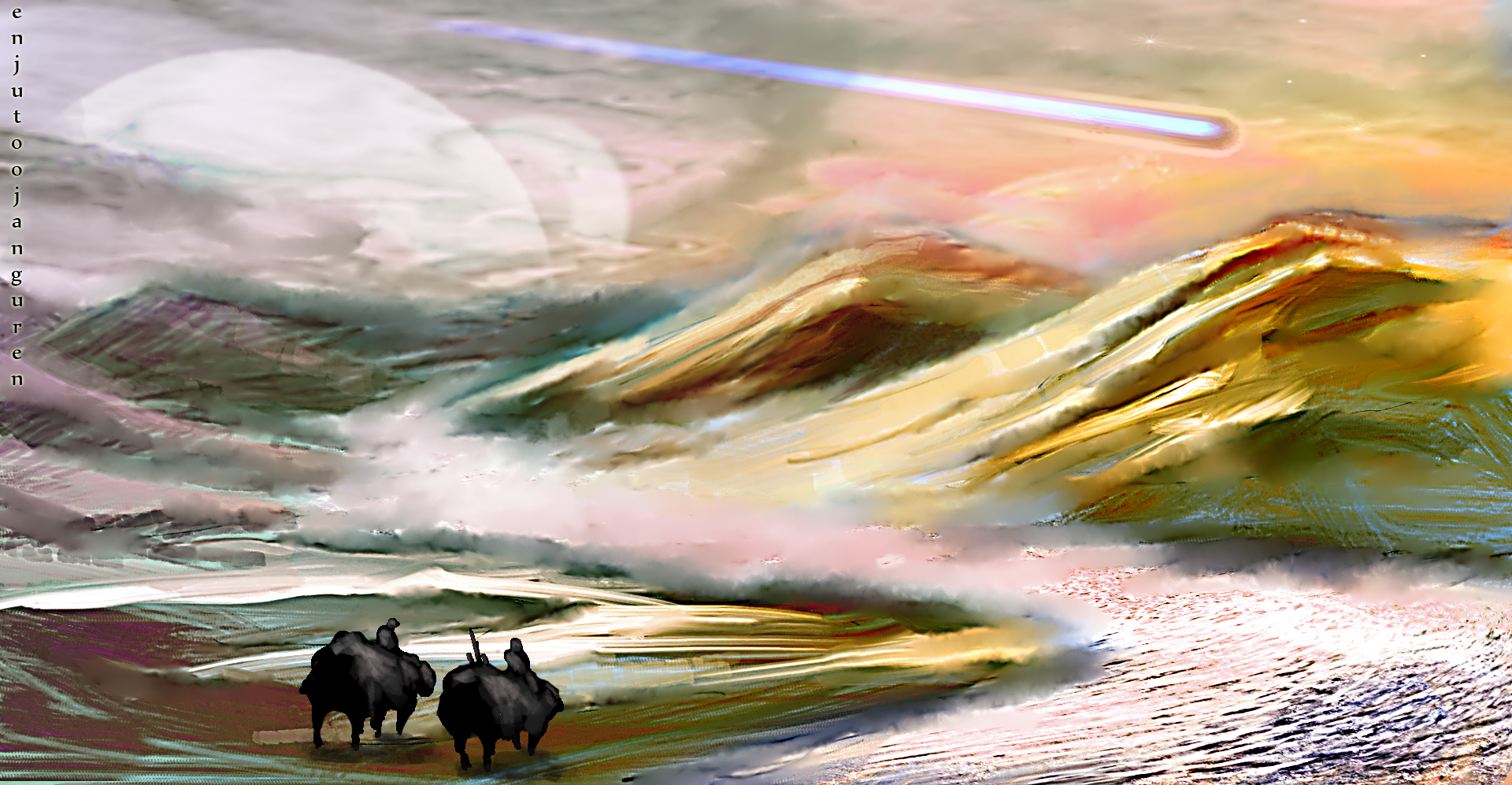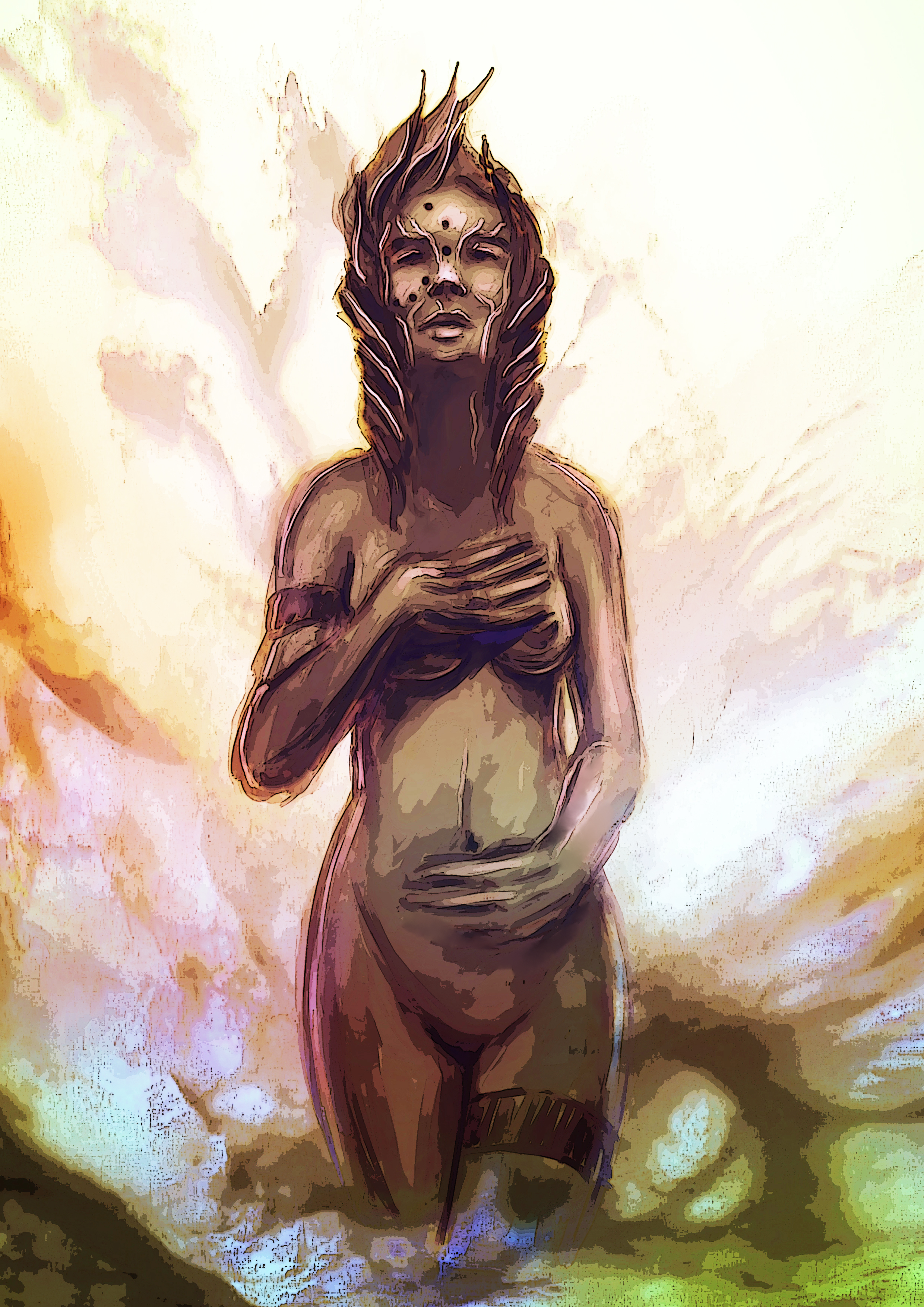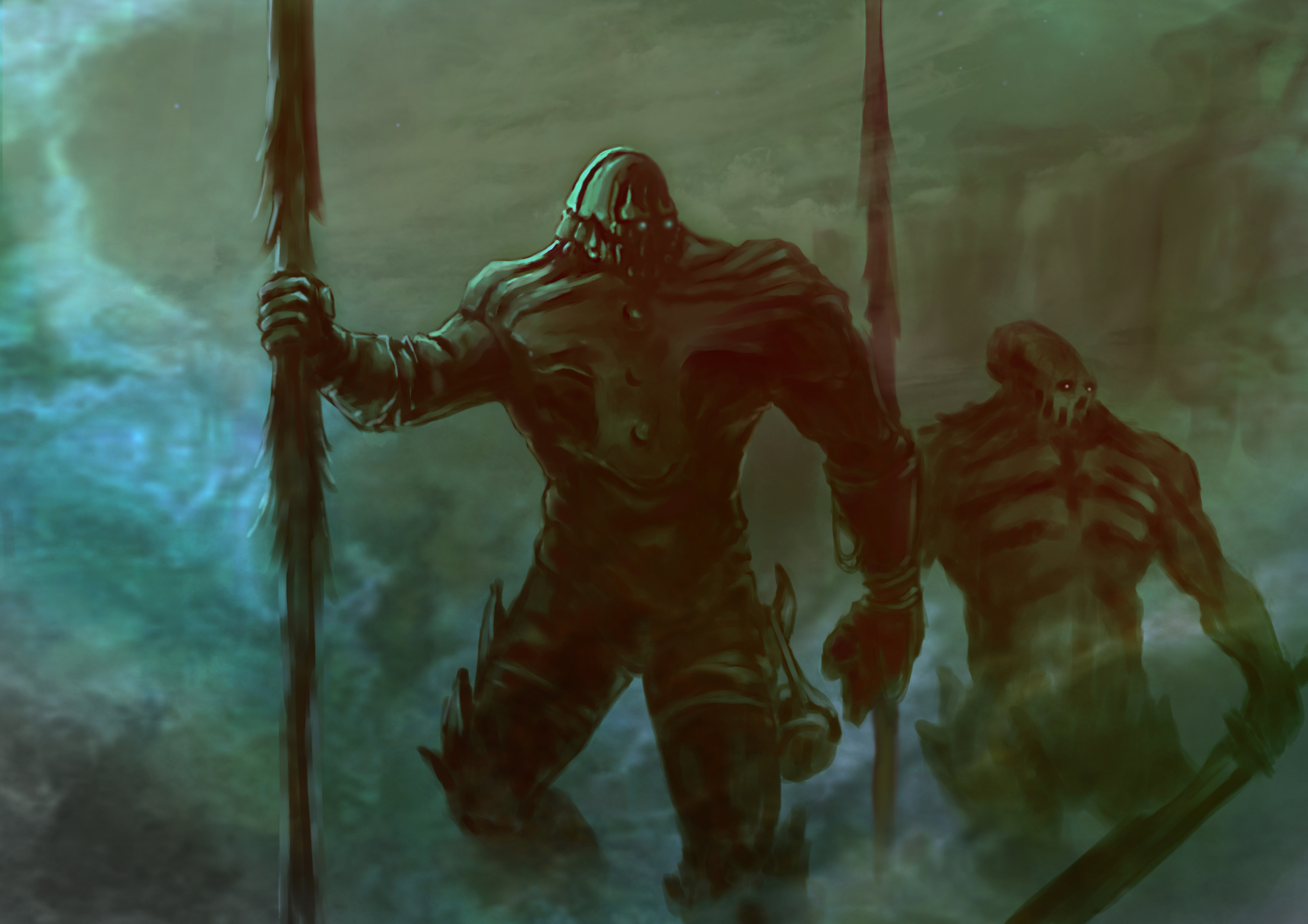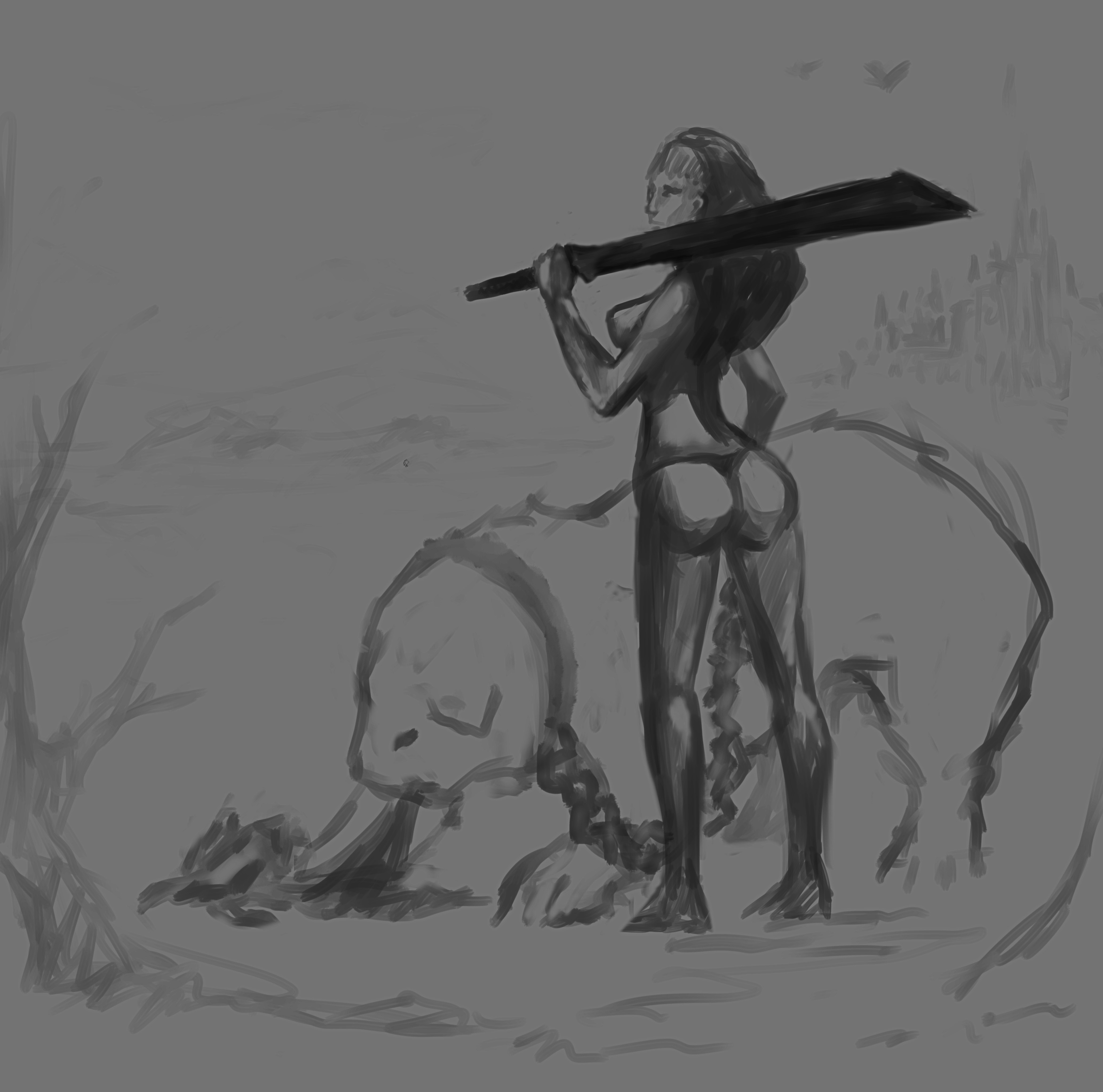 La segunda imagen, mi preferida, tiene muchos elementos para ser brutal, el color está genial, los trazos de la cueva/estructura de la izquierda me encantan, los personajes están estupendo, lo que me da pena y creo que mejoraría un mundo está imagen es el rio de laba. Si hubieras hecho un recorrido sinuoso con meandros para ese río de labas o estrías, mejoraría pero un mundo. Porque así queda poco natural.