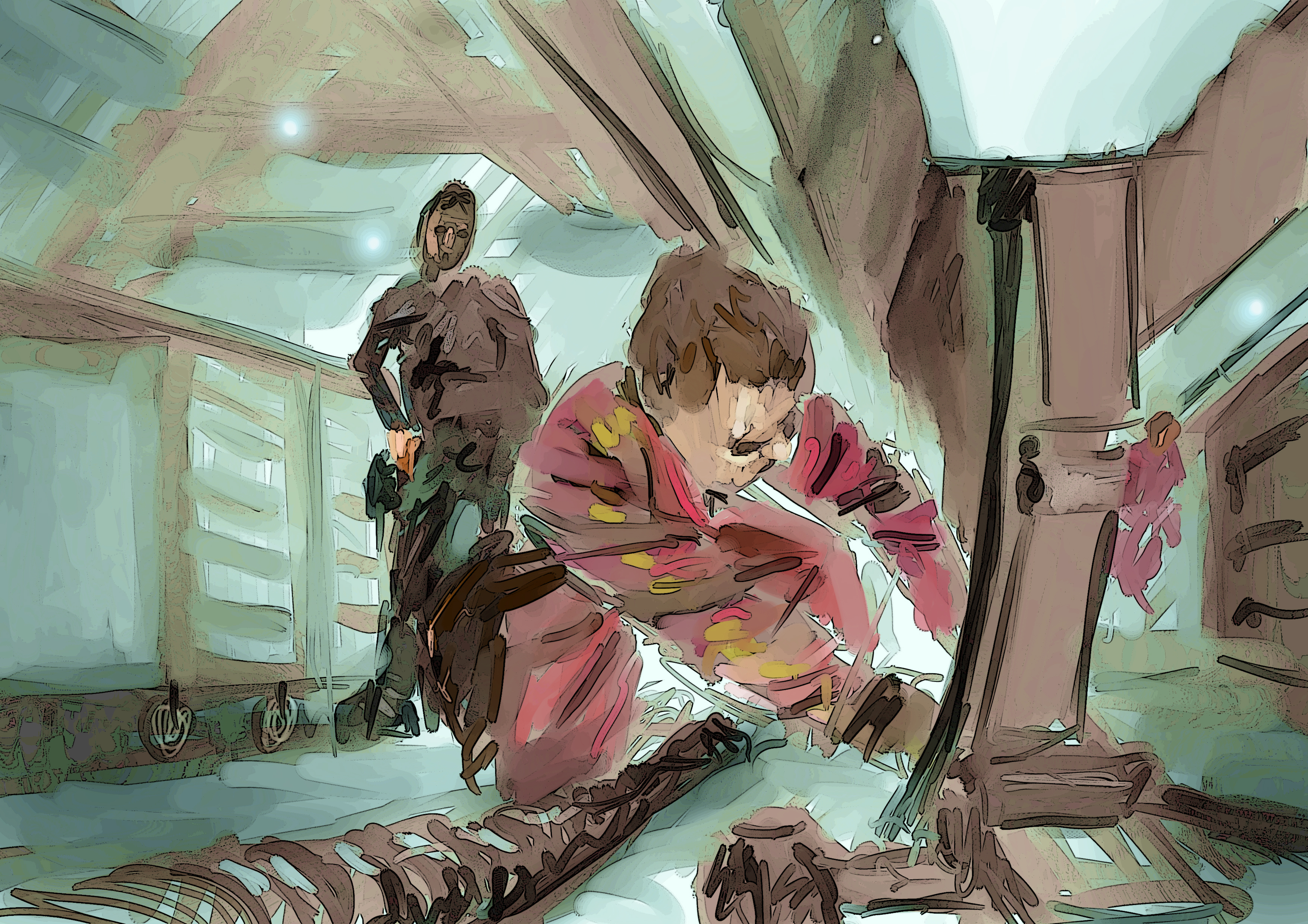 Y el tercero del robot me flipa el trazo y el color. Lo que veo que puedes mejorar es la estructura del robot, cuya proporción de piernas falla, se nota en la derecha qué ha quedado corta. De resto me gusta. En general creo que puedes mejorar la composición y cómo guías la mirada del espectador por la imagen.