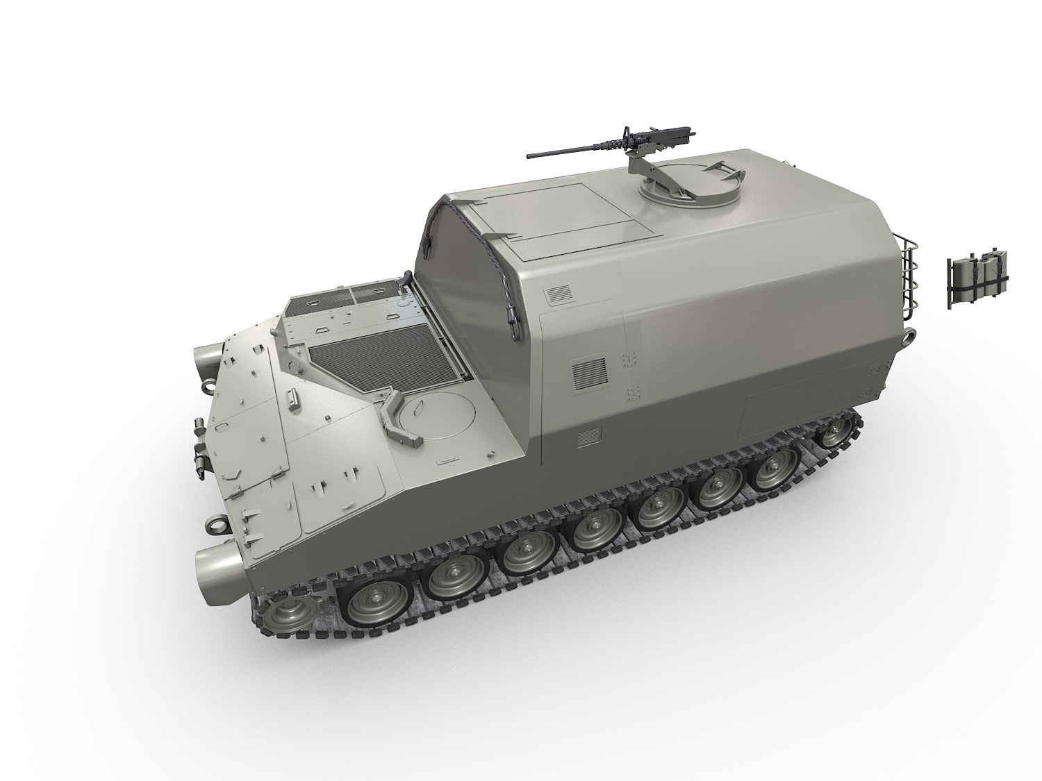 Aquí tienes los tres 8x8 que he hecho. Van sobre la base del mismo vehículo. El primero es un vehículo de exploración, el VE36, lleva un mástil con una bola optrónica que "ve" lo que hay alrededor y lo transmite. El segundo, VS27, es uno de ingenieros, un recuperador, con su grúa y todo. El tercero es el trasto base, un ZBL-09, y otro de los 6x6 de antes. Hice tres de este, cada uno con una torre distinta. Este es el de más enjundia, le llaman WM551.