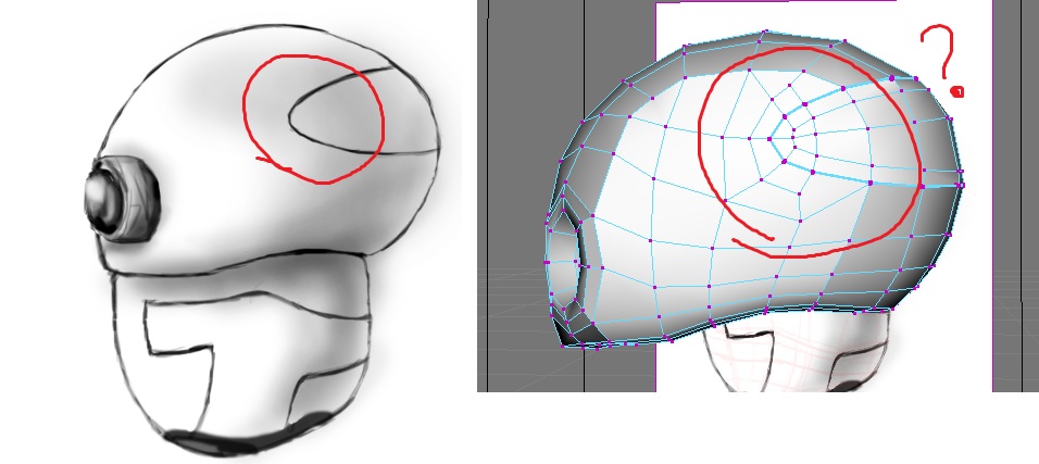 Ustedes, que son los expertos en la materia quería consultarles si resolví correctamente el tema del loop en la zona señalada, (a mi se me hace que tiene más polígonos de los necesarios) y es que se complica el asunto cuando le quiero agregar un loop (2da imagen) para él efecto hard surface. Definitivamente estoy haciendo algo mal.