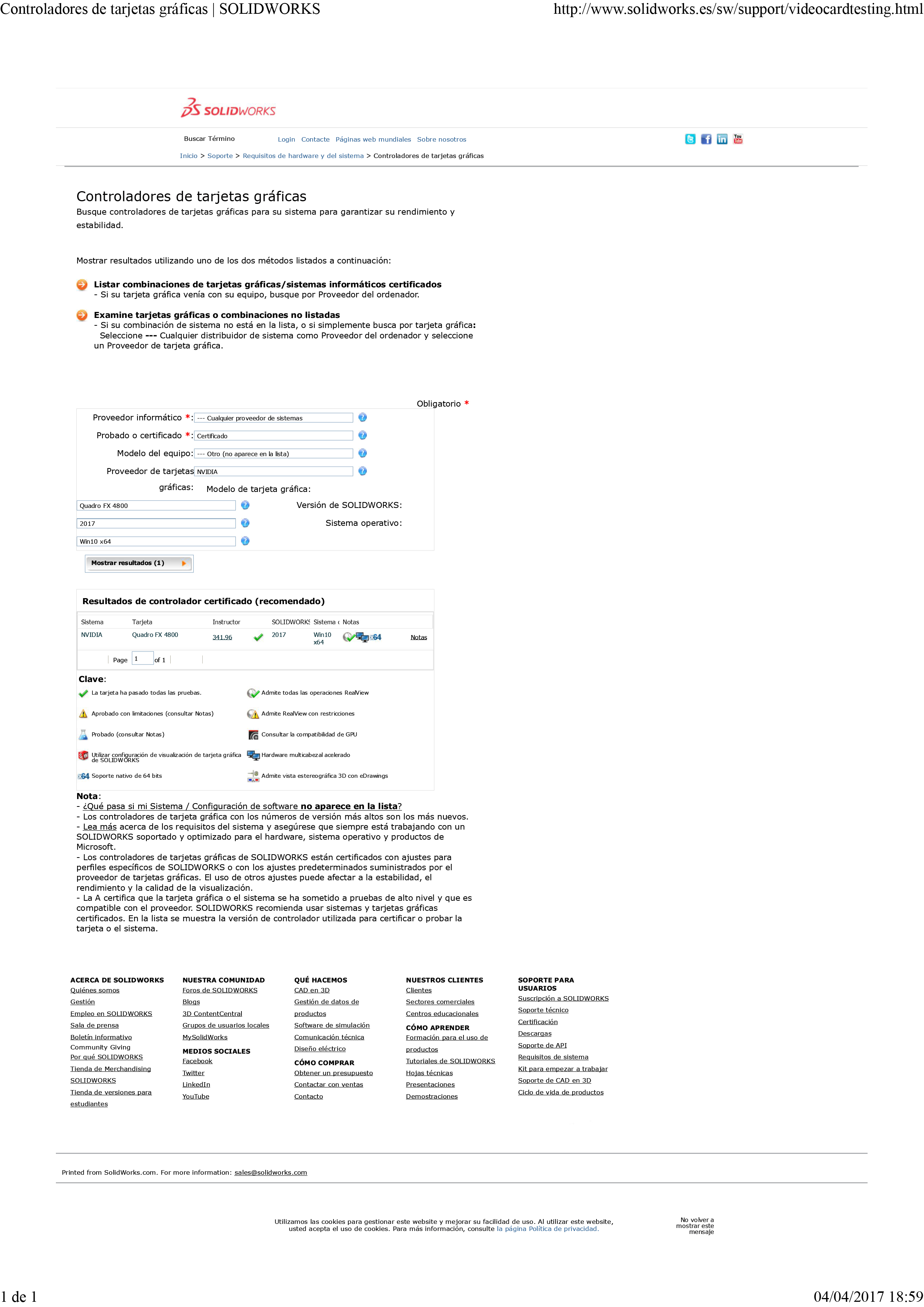 Hola guerra, yo la utilizaba con rhinoceros y la verdad es que el funcionamiento era muy bueno, con SolidWorks no sé qué tal andará, mira a ver en la página de Solidworks, deben de especificar el tipo de gráficas específicas para cada versión y los drivers específicos, si te vale, eres el primero en la lista para quedártela ok?