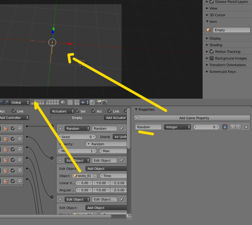 Luego al crear un número aleatorio, pongo un Sensor de tipo Property, dónde lo pongo la propiedad creada y un enlace con EDIT OBJECT, que es un Actuator con el cual puedes cargar una malla (en este caso un texto) que será el del número seleccionado.