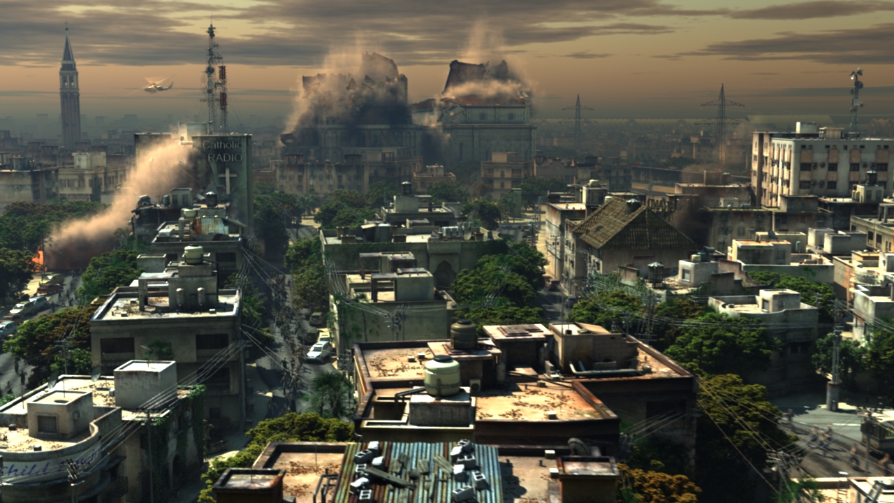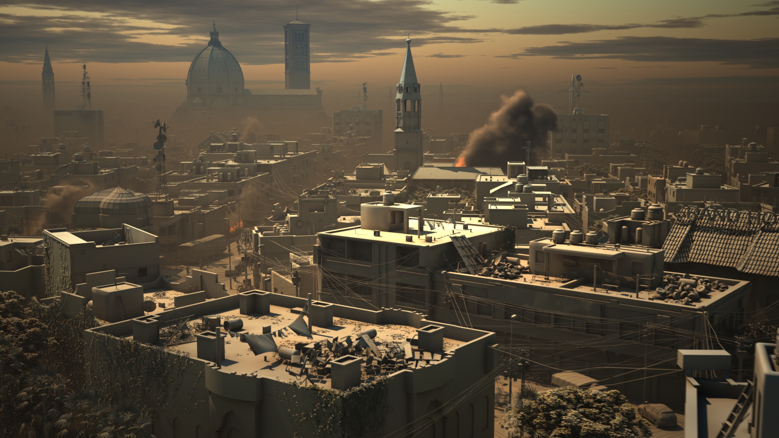 Intenté recrear ese clima lo mejor que pude, no es fácil por cuanto es mucha MUCHA geometría la necesaria para lograrlo y la ordenador mía qué es medio viejita va despacio es una i7 4770 K y corro 3dsmax 2010 en esta escena.