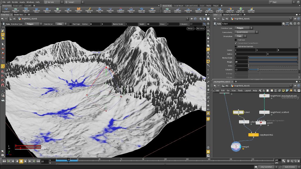 Y en el capítulo 4 vamos a generar un terreno, Houdini incluye un conjunto de herramientas dedicado para generar y dar forma a los terrenos. Estas herramientas representan el terreno usando volúmenes 2D, llamados campos de altura, donde cada vóxel contiene la altura del terreno en un punto de cuadrícula particular. La ventana gráfica Houdini le permite visualizar campos de altura 2D como superficies 3D. También puede configurar campos de máscara qué se pueden usar para enfocar sus ediciones apartes específicas del terreno. En esta lección, construirás terrenos usando patrones, ruido y erosión y luego exportar los resultados para usarlos en un motor de juego.