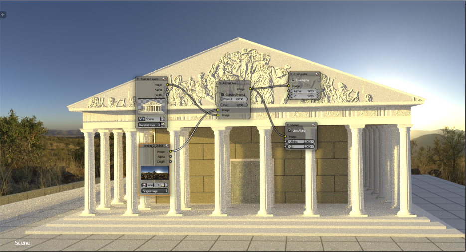 Renderizo la escena con fondo transparente porque si rebajo la intensidad de iluminacion el cielo me queda demasiado oscuro