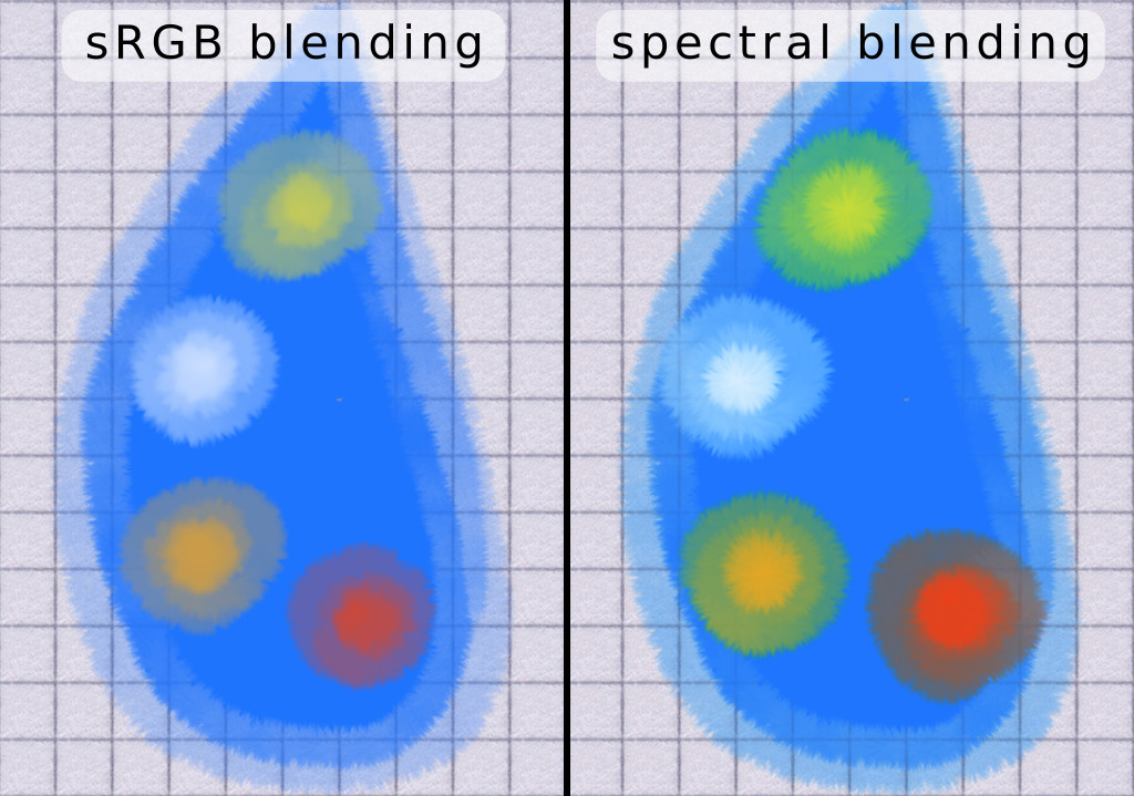Por defecto, MyPaint 2.0.0 usa composición lineal y mezcla espectral (modo pigmento). Esto se presta bien para crear obras de arte que emulen el uso de los medios tradicionales. Sin embargo, esto también tiene algunos inconvenientes, como menor rendimiento, compatibilidad con archivos de Krita o que trabajar fusionando capas no se puede hacer ahora mediante WYSIWYG.