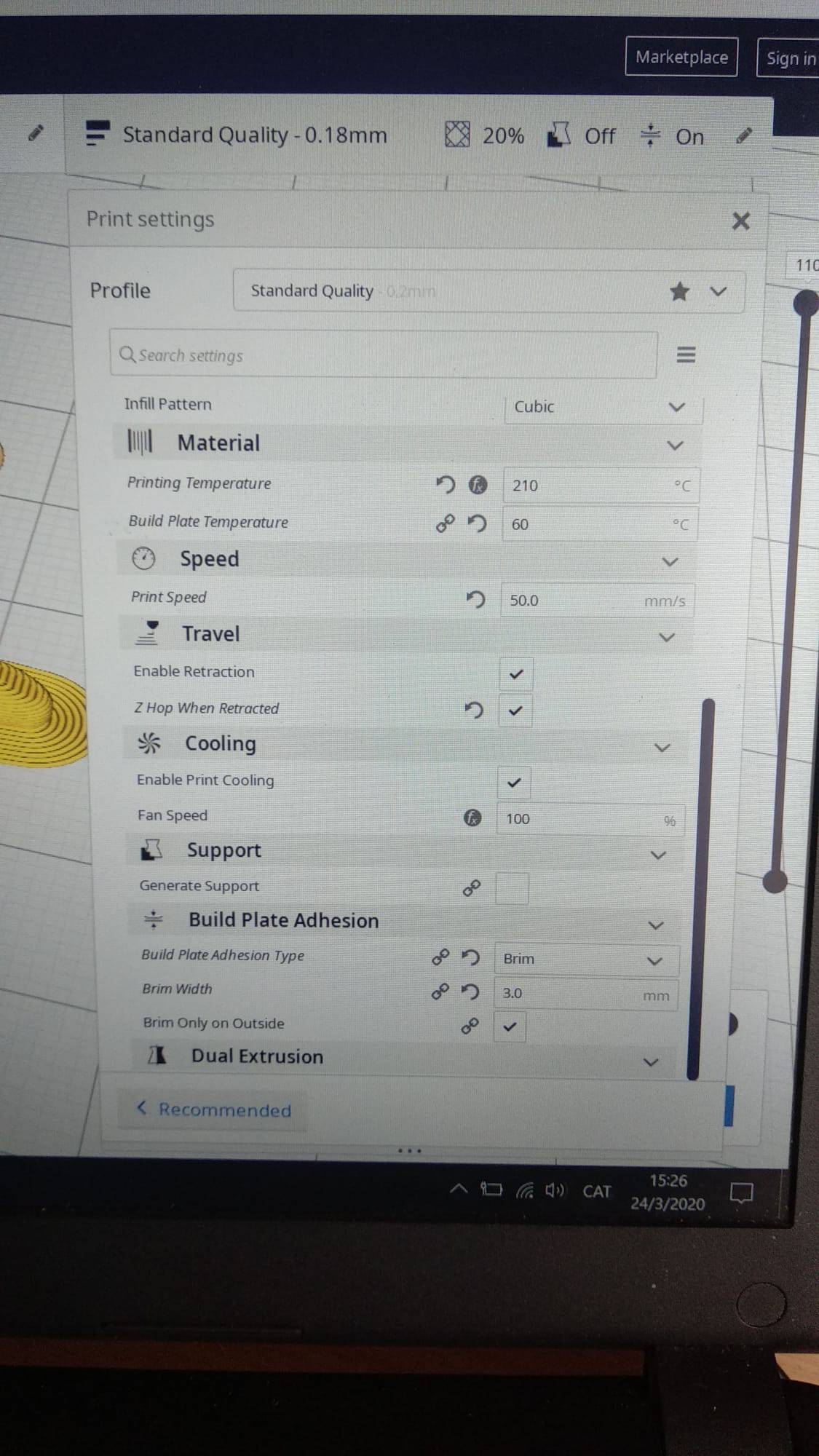 Y yo, le pondría una balsa a la hora de preparar el modelo en el CURA, una balsa o una falda, para que la primera impresión quede fuera del modelo y así te aseguras que no falla la primera extrusión de filamento.