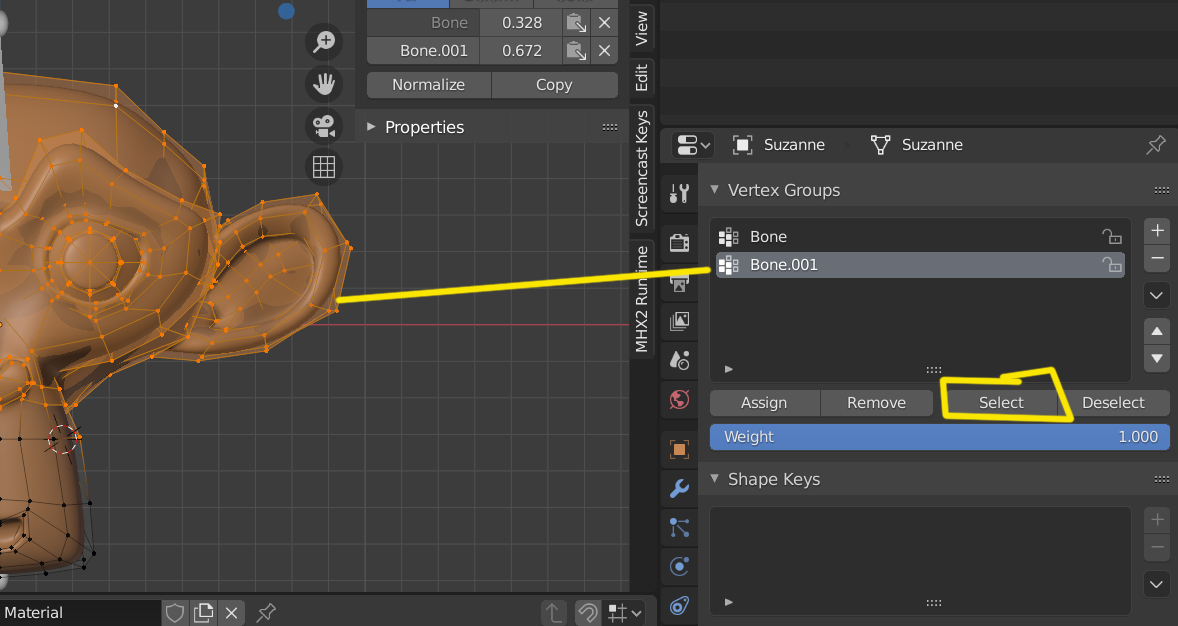 De todas formas si quieres puedes mirar en Vertex Weights puedes ver si un vértice está asignado a un hueso o a varios y que fuerza (peso) tienen asignado.