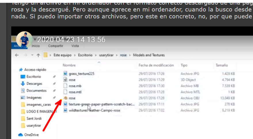 Hola a todos, tengo un archivo en mi ordenador con el formato correcto descargado de una pagina hecha para ello. Quería hacer una cosa con una rosa y la descargué. Pero aunque aparece en mi ordenador, cuando la busco desde Blender, como podéis ver en el video, no aparece nada. Si puedo importar otros archivos, pero este en concreto, no, ¿por que puede ser?