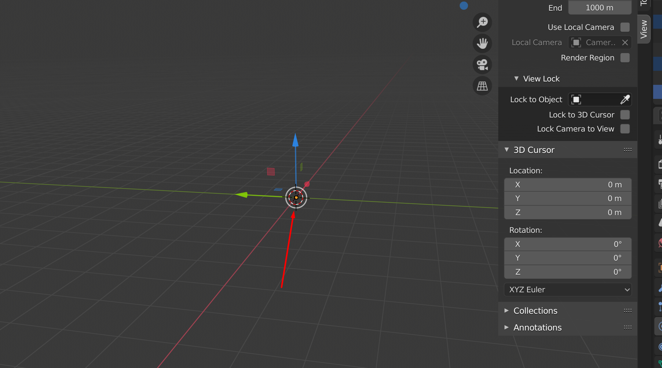 Y en todo caso, si el objeto es tan diminuto que no lo ves, solo lo selecciones en el Outliner y luego presiona el . (punto) del teclado numérico y se debería acercar la vista para poder rotar a su alrededor sin problema.