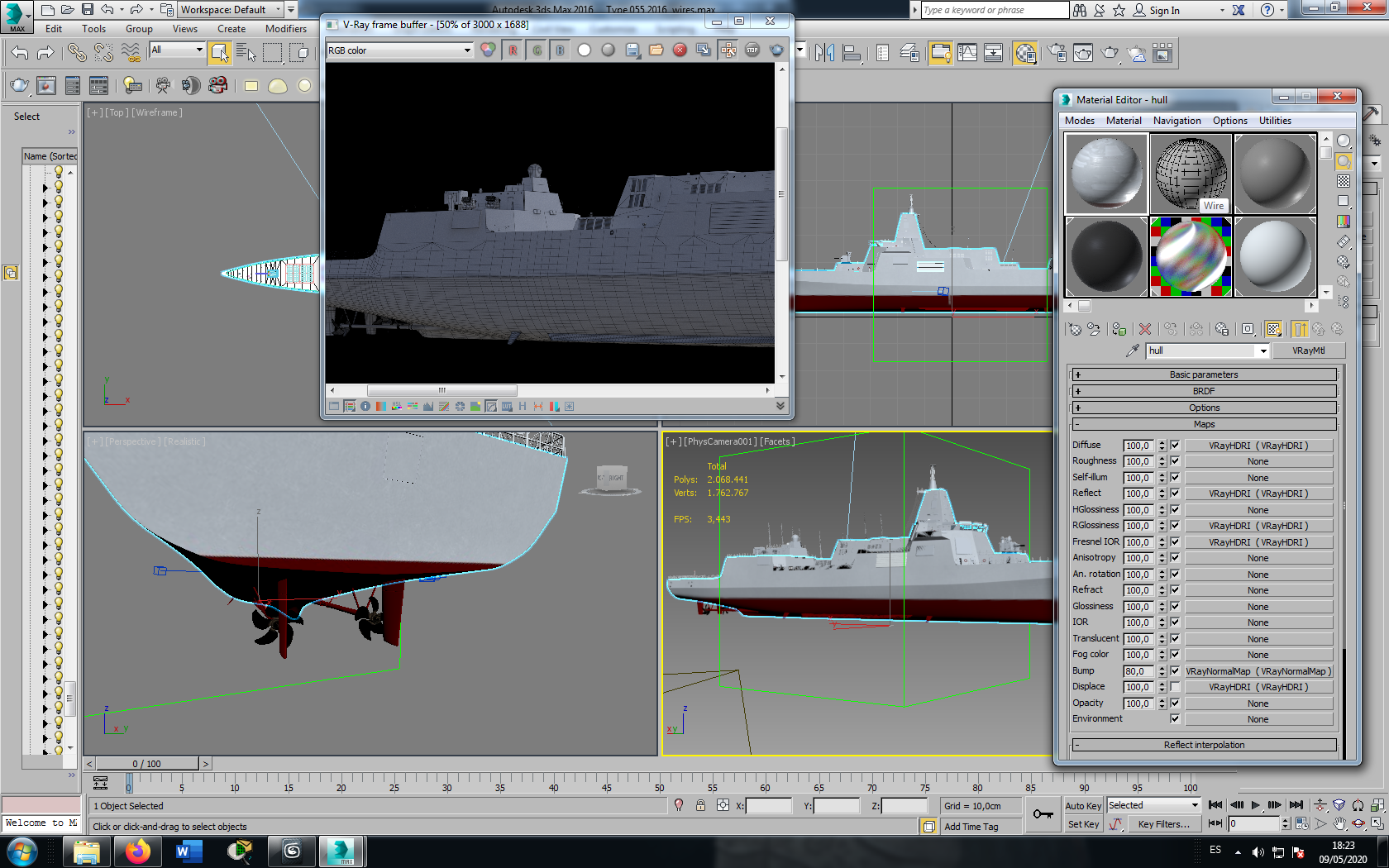 Así que empiezo a trastear en el editor de materiales. Veo un material que es el que le da el wireframe y lo elimino. Yo creía haberlo solucionado, pulso render y Zasca ! una mierda que te comas. Me sale gris, sin malla esta vez, pero en el visor se ve bien.
