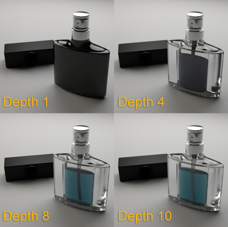 Las siguientes imágenes muestran diferentes valores de profundidad de rayo. Las sombras de contacto y los reflejos mejorados entre los componentes reflectantes cercanos se producen a medida que aumenta la profundidad de reflexión. Hay una mayor precisión con componentes transparentes a medida que aumenta la profundidad de refracción. Las refracciones precisas requieren valores de profundidad elevados.