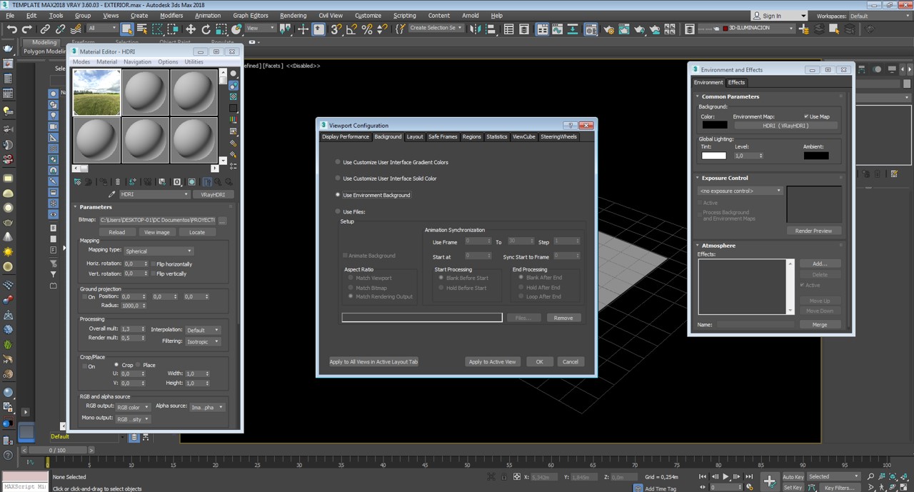 Saludos colegas, esta es la primera vez que uso uno de estos foros y es que ya estoy algo desesperado. Estoy usando 3ds Max 2018 + Vray 3.60.03, he configurado mi archivo HDRI siguiendo todos los paso que yo mismo ejecutaba en 3ds Max 2015, sin embargo, el fondo de mi Viewport se muestra en color negro, Pero, al realizar un Render puedo visualizar el fondo de mi archivo HDRI, estoy asumiento que sea un error en la configuración de mi Viewport, las opciones se me agotan y ya no sé qué más hacer. Dejo por aquí algunas imágenes que muestran la configuración del HDRI, desde su creación como material, hasta ser asignado este mismo como imagen de fondo.