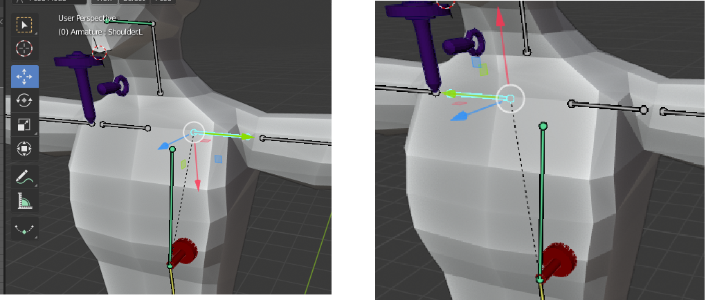 Ayuda, estoy tratando de hacer rigging a un personaje en Blender, cree el esqueleto a un lado y lo replique al otro, pero me paso algo raro en la parte de los hombros, y sospecho que esto mismo me complica a la hora de agregar drivers, lo que pasa es lo siguiente: al seleccionar un hombro los puntos de movimiento me aparecen a un lado y al presionar el otro apuntan al contrario, adjunto imágenes. Agradecería ayuda, puesto que llevo varios días tratando de arreglarlo.