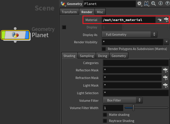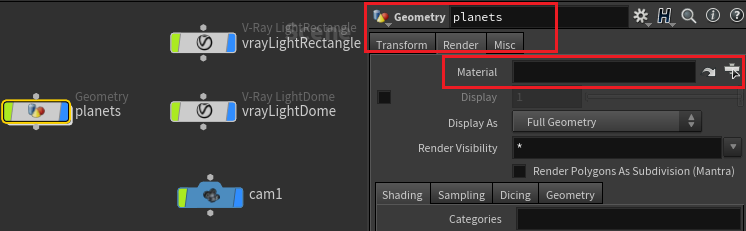 Para obtener un renderizado correcto, la geometría tiene que ser empaquetada antes de asignar los materiales. Es por eso que establecemos un paquete SOP antes del material SOP. La geometría debe empaquetarse cuando se utiliza este flujo de trabajo porque Vray se ocupa del desplazamiento en el nivel de objeto. Vray para Houdini exporta cada primitivo empaquetado como un objeto independiente, lo que le proporciona la capacidad de dividir la geometría de nivel SOP en formas individuales a las que asignar diferentes mapas de desplazamiento.