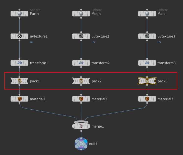 Agrega UVTexture SOP para cada una de las tres esferas. Con la ayuda de transformar los nodos SOP los mueven a lo largo.